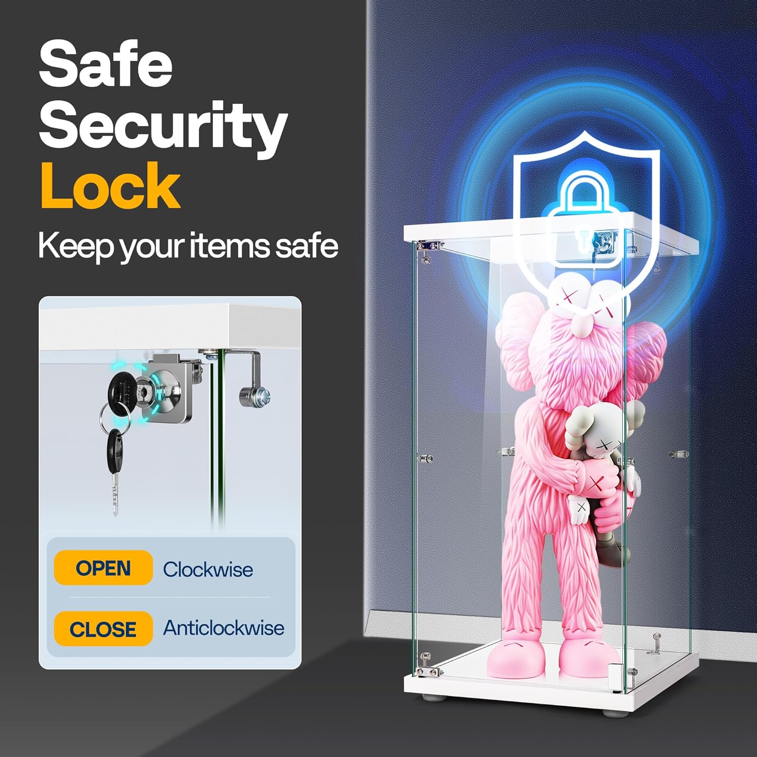 - SAFE SECURITY LOCK: The glass display showcase comes with a security lock to keep your items safe; With the considerate security lock, you can store your goods without the worry of loss even when you put them in a public area