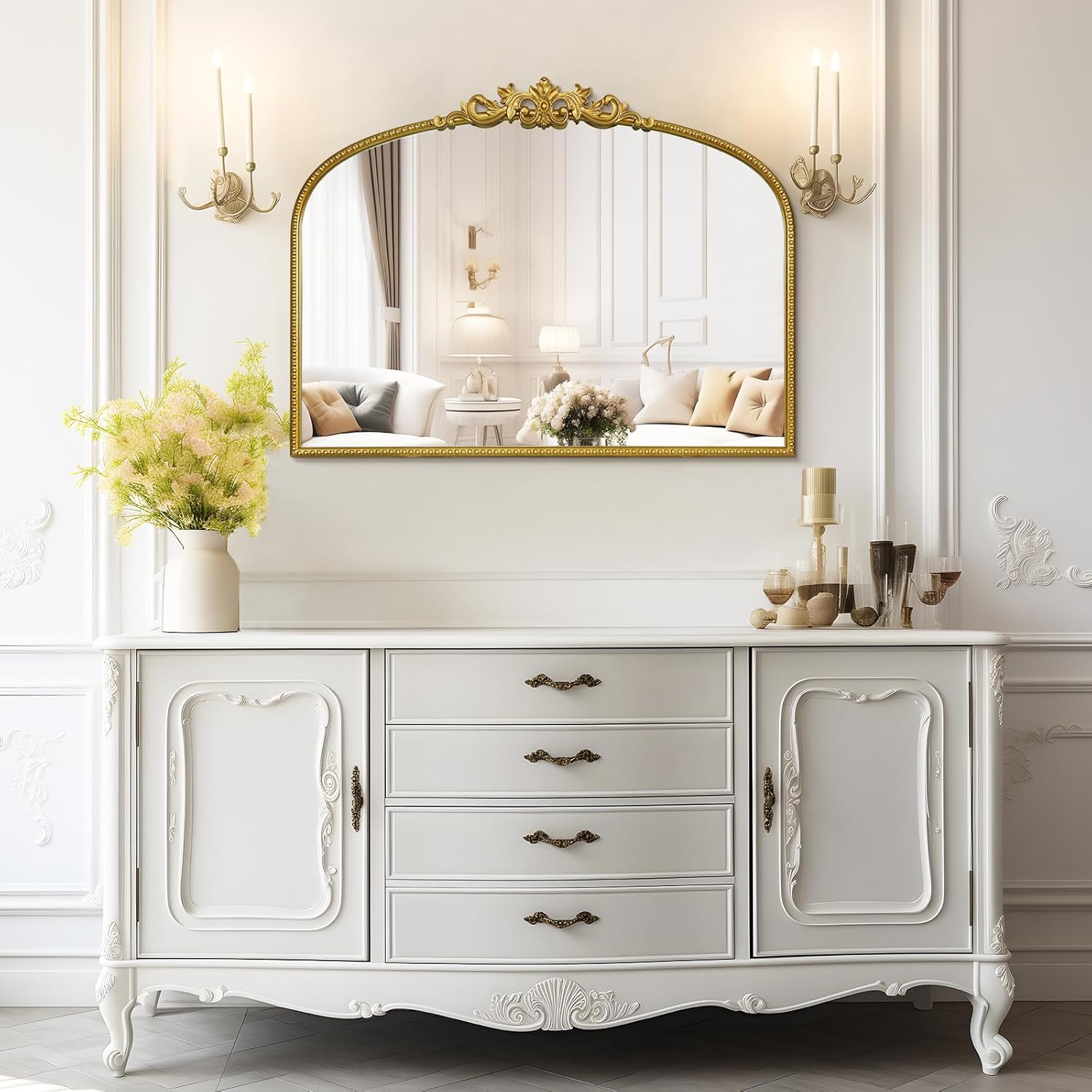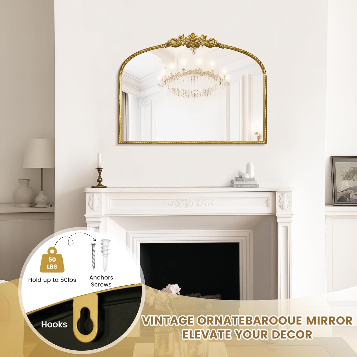 - Unique Design: This gold vintage mirror features an arched silhouette with intricate unique flower patterns, adding vintage charm to any interior. Its ornate design makes it a striking centerpiece in living rooms, hallways, or bedrooms.