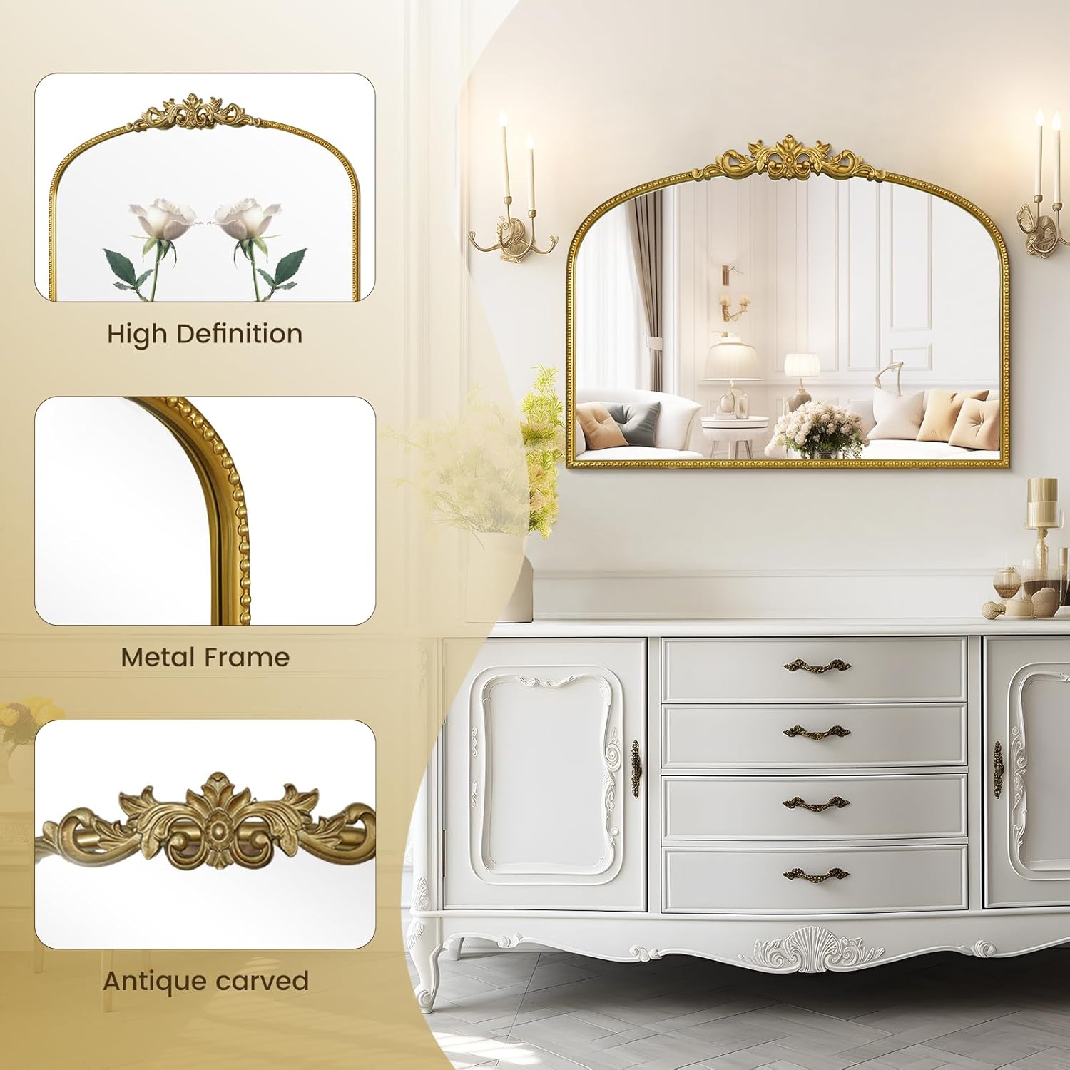 - Metal Frame: Built with a durable metal frame, this gold antique mirror is moisture-proof and rust-proof, ensuring it maintains its elegant appearance over time, even in humid environments like bathrooms.