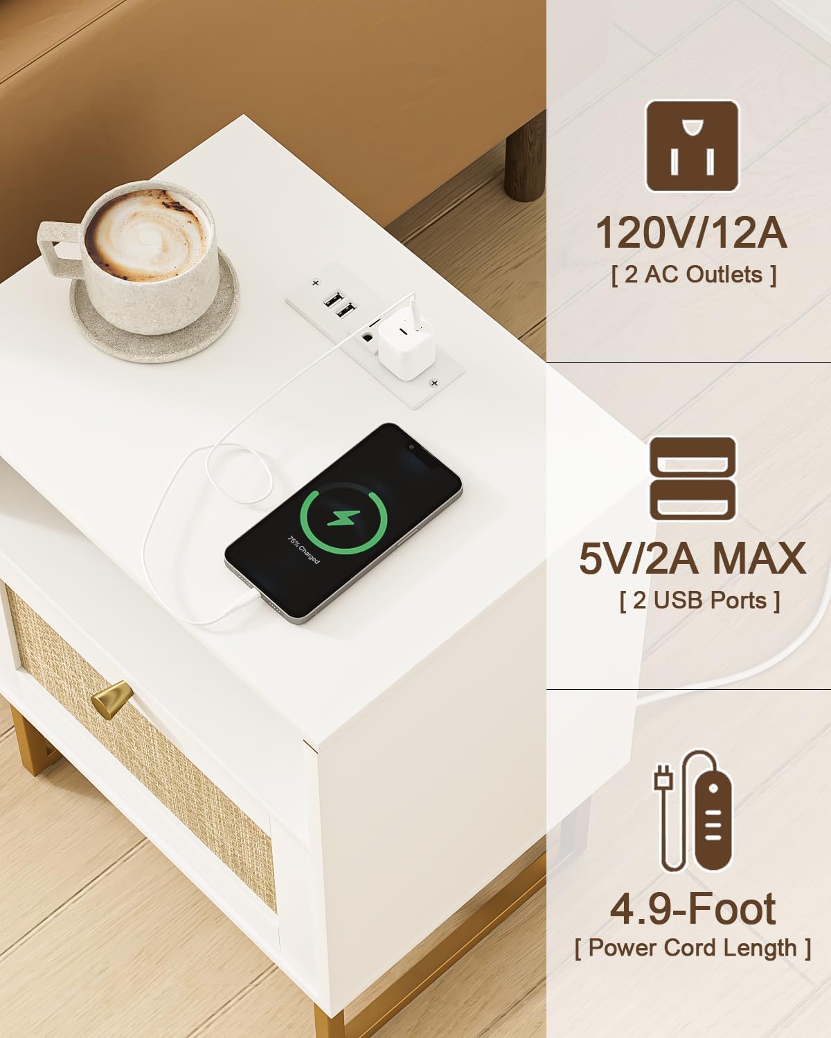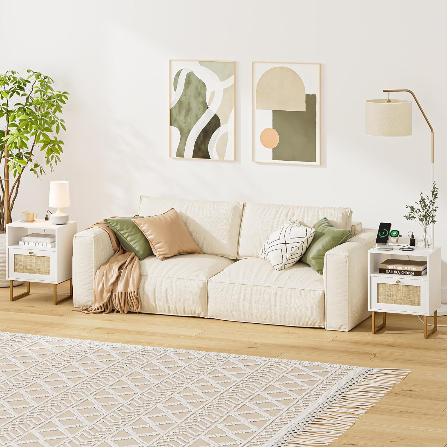 Masupu Extra Large Rattan Nightstand with Charging Station,Boho Night Stand Modern Farmhouse Wood Bedside Table with Storage Drawer and Open Shelf,Side End Table for Bedroom,Living Room,Office White