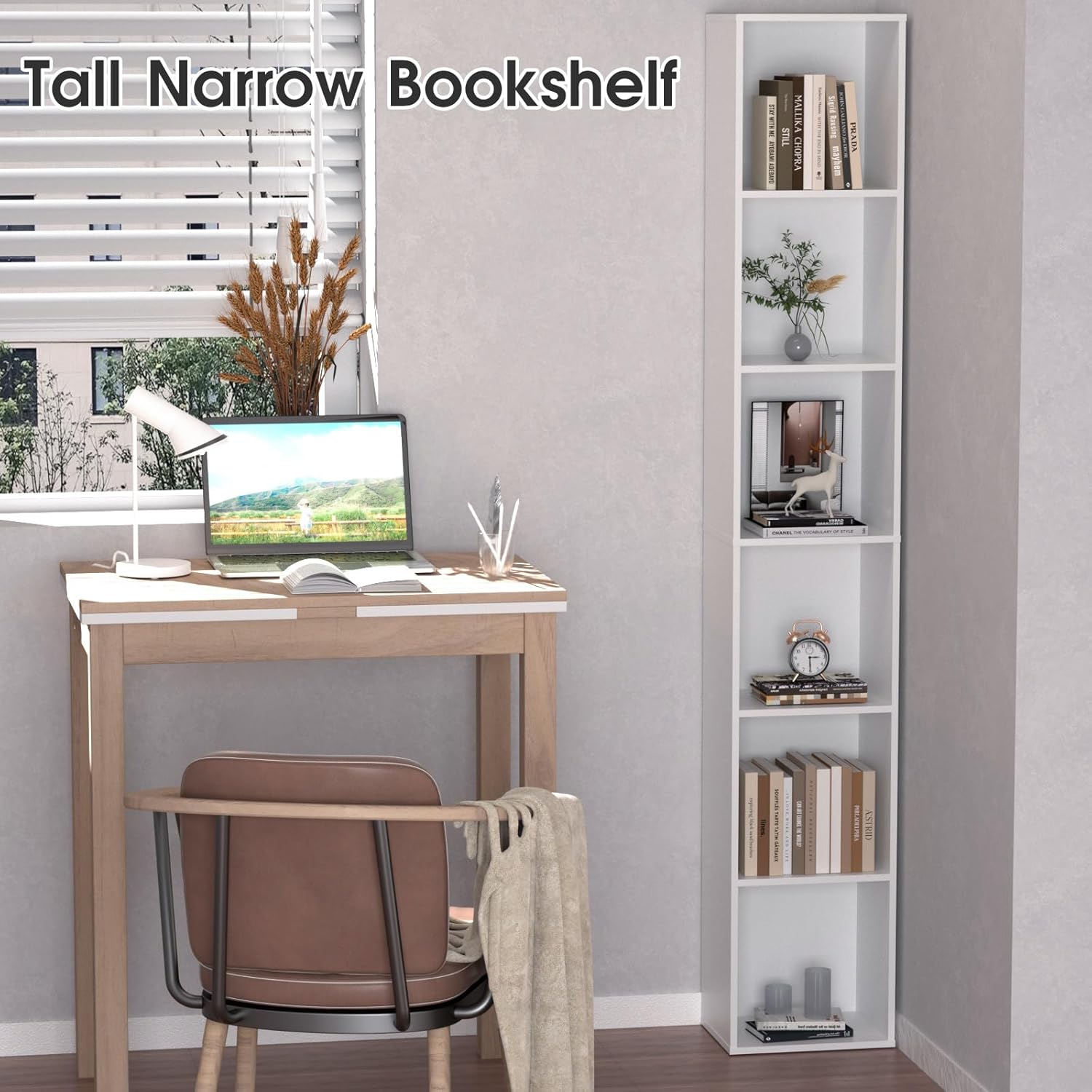 - 【VERSATILE USE】The tall and narrow bookshelf takes up little space and fits into any tight corner of your home. The modern minimalist design can fit perfectly into your living room, bedroom, study or bathroom.