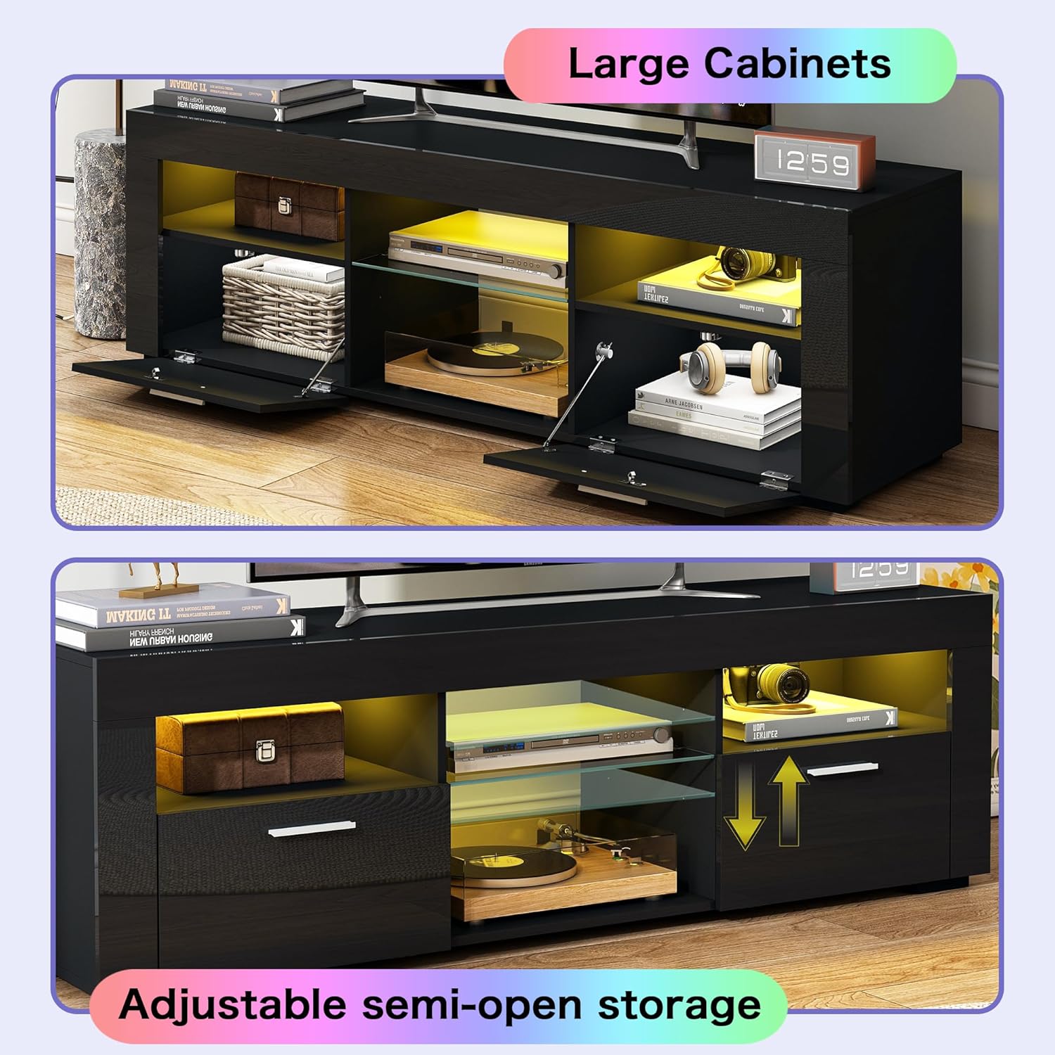 - [ORGANIZE YOUR SPACE] This contemporary gaming entertainment center measures 51''L x 13''W x 15.7''H. It features 2 spacious cabinets, 1 adjustable open storage area, and 2 open shelves, providing ample room to store and display your media collection, gaming consoles, and other electronics. The tempered glass shelves and open-back design offer flexibility in organizing your belongings to suit your personal preferences.