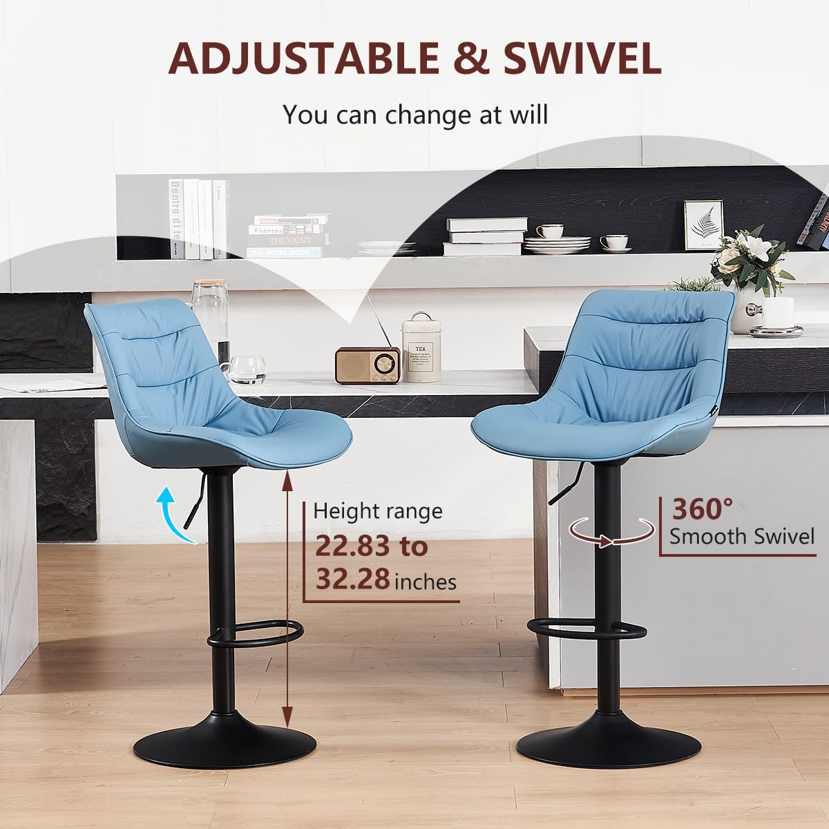 Kidol & Shellder Bar Stools Set of 2 Adjustable Swivel Blue, PU Leather Upholstered with Back, Modern Counter Height Stools for Kitchen Island, Home Bar