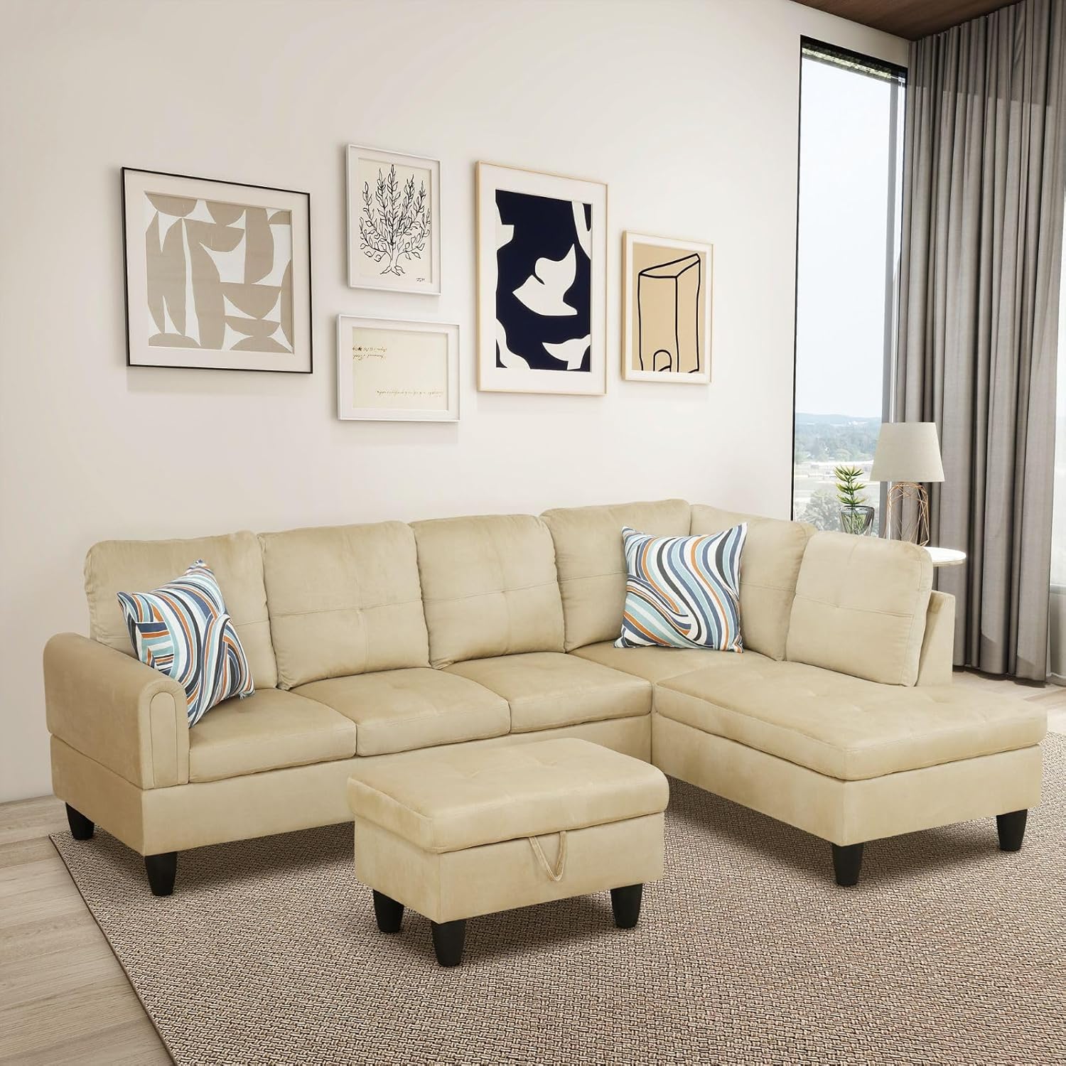 Beige L-Shaped 3-Piece Flannel Sofa with Storage Ottoman Set, Sectional Couch Sofa Set for Living Room, Office, Small Space
