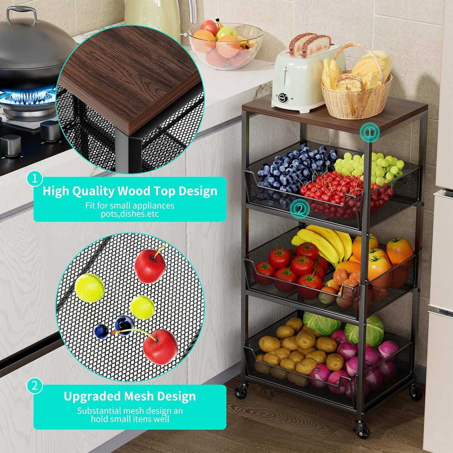 - [Wood Top for Extra Storage]: Enhance your kitchen's functionality with the solid wood top, providing a stable surface on the kitchen cart for essentials like pots, pans, or spice jars. This feature adds style and space-saving functionality, perfect for keeping your fruit basket for kitchen organized in any kitchen setup