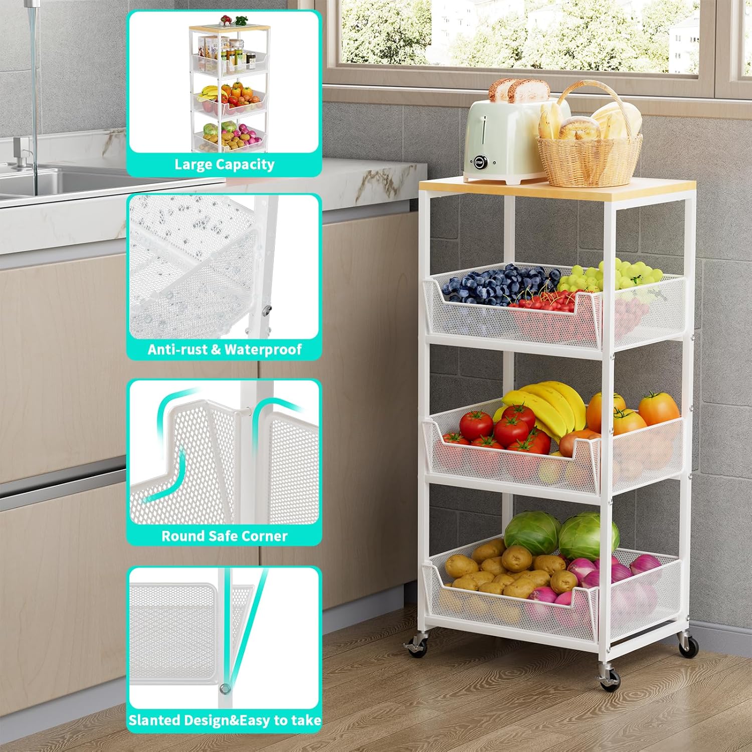 HapiRm Fruit Basket Kitchen Cart - 4-Tier Rolling Storage Cart with Wheels, Wood Top Utility Pantry Cart for Vegetables, Potatoes, Onions, Bread, Snacks