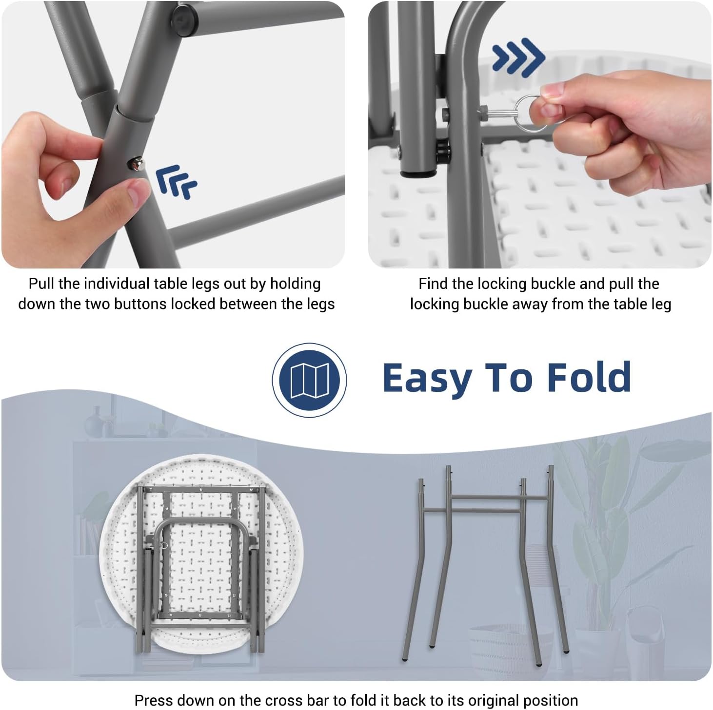 - EASY TO INSTALL: Our round folding table can be quickly installed in minutes. Fully pull up the legs attached to the tabletop, insert and lock the split legs in the form of combination rods. After completing, the pub table can be put into use