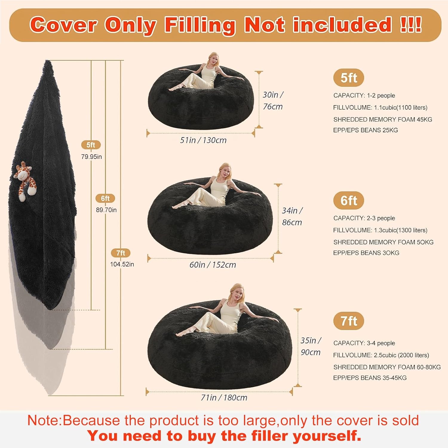 Bean Bag Cover(No Filler), Fluffy Beanbag Chairs Cover Only, Stuffed Animal Storage Bean Bag, Washable Lazy Sofa Beanbag Cover without Filler, 6FT, Black