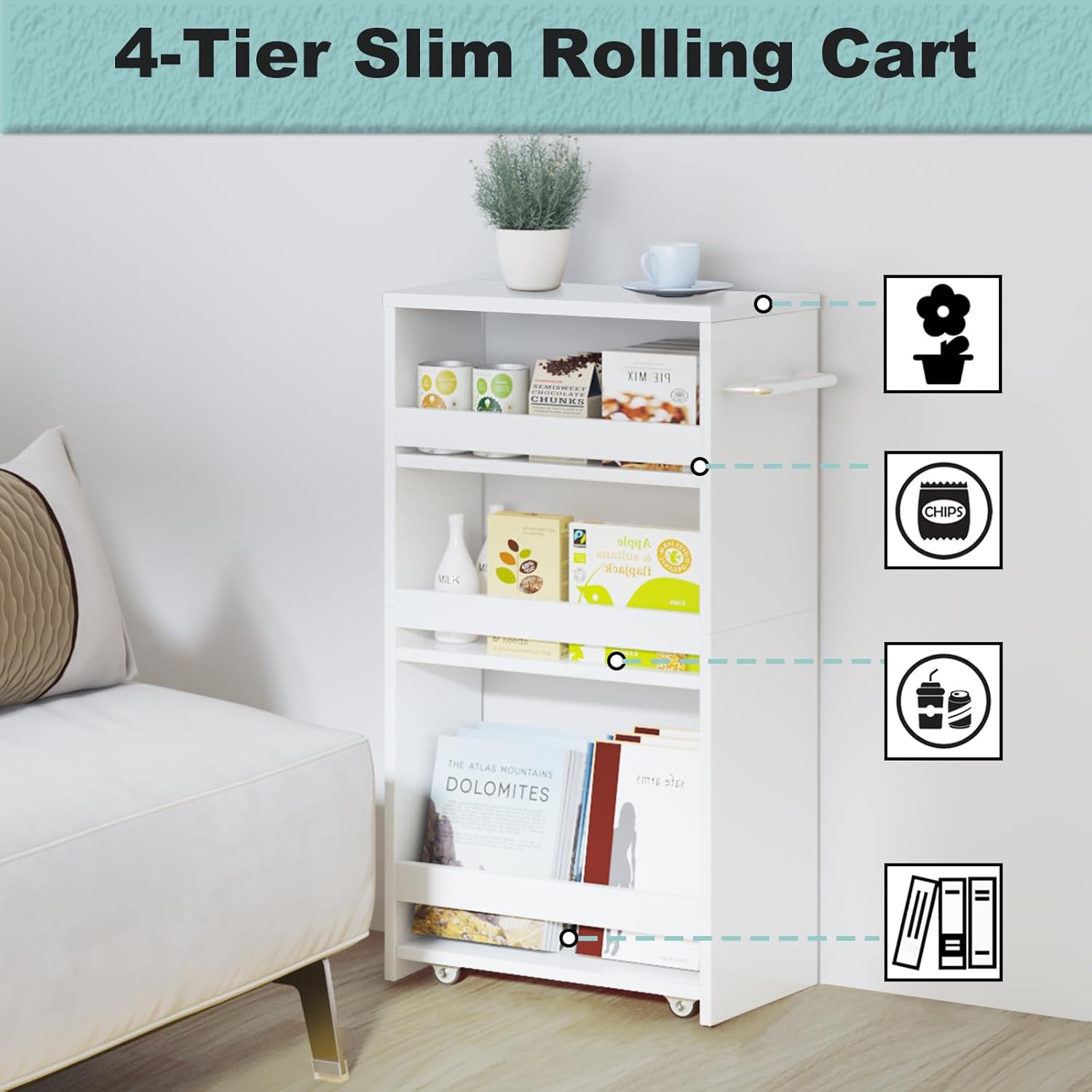 MARTY Rolling Storage Cart 7.9" W, 4-Tier Kitchen Cart with Wheels Handle, Slim Storage Cart Mobile Shelving Utility Carts for Bathroom Laundry Room Organization Narrow Places (All White)
