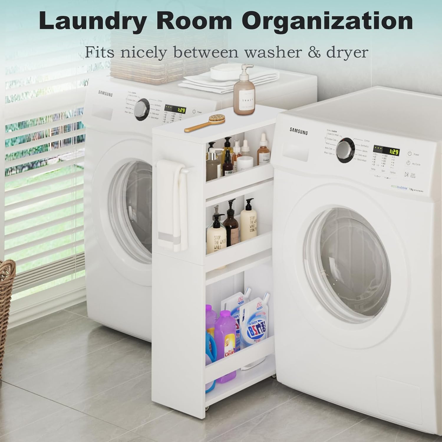 - 【Slim Design for Small Spaces】The size of slim storage cart is 7.9"D x 15.75"W x 31.5"H. It can provide versatile storage in compact space, kitchen next to fridge or closets, laundry rooms between washer and dryer, living room, bathrooms.