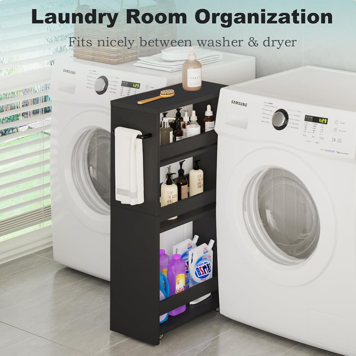 - 【Slim Design for Small Spaces】The size of slim storage cart is 7.9"D x 15.75"W x 31.5"H. It can provide versatile storage in compact space, kitchen next to fridge or closets, laundry rooms between washer and dryer, living room, bathrooms.