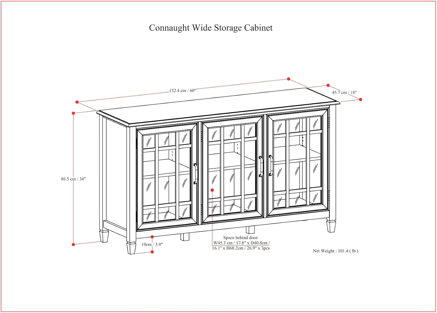 - Multipurpose cabinet offers plenty of functional storage: three (3) tempered-glass doors open to reveal three (3) adjustable shelves.