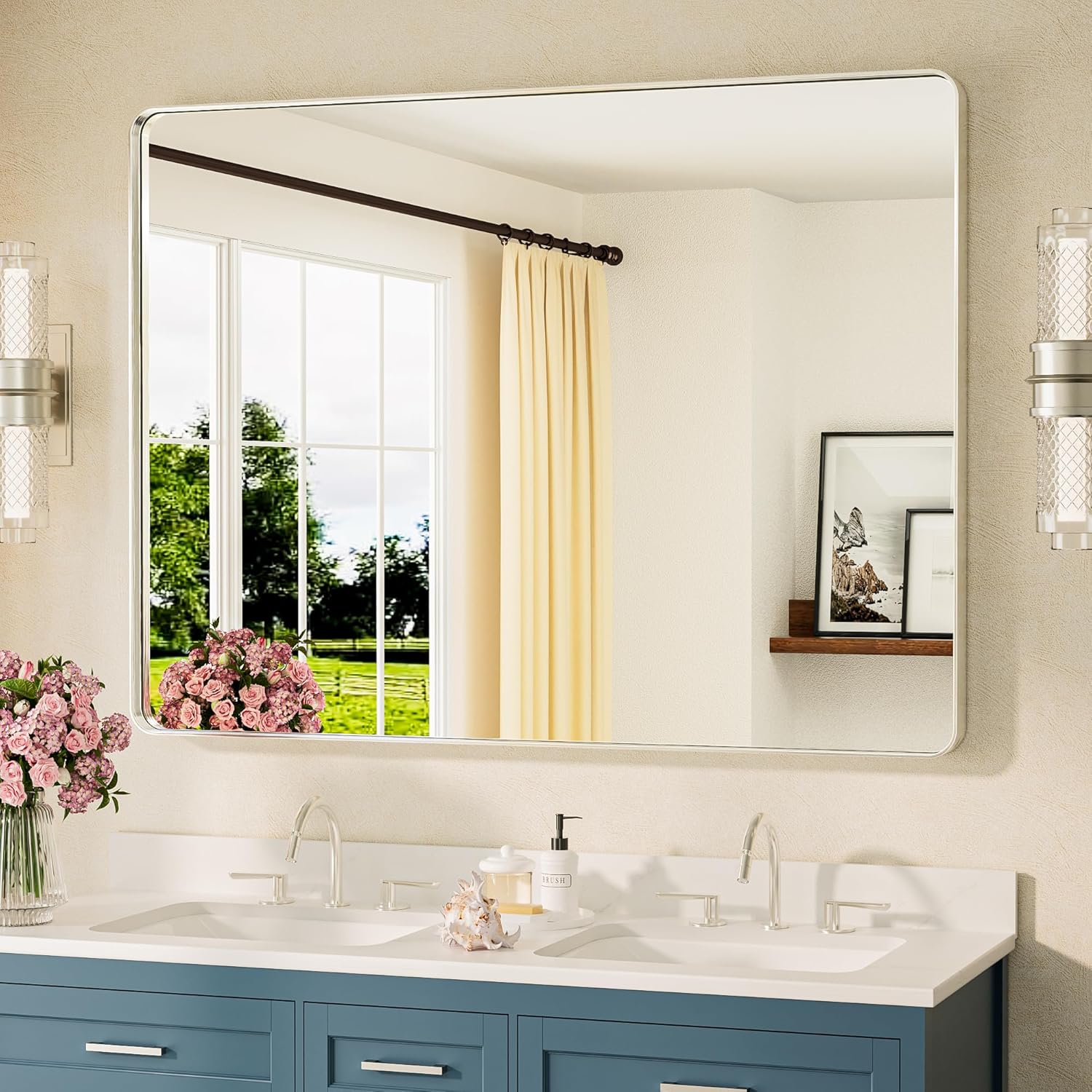 TETOTE 48 x 36 Inch Brushed Nickel Bathroom Mirror Metal Framed Bathroom Mirror, Tempered Glass, Modern Farmhouse Wall Mounted Mirror for Decorative(Horizontal/Vertical)