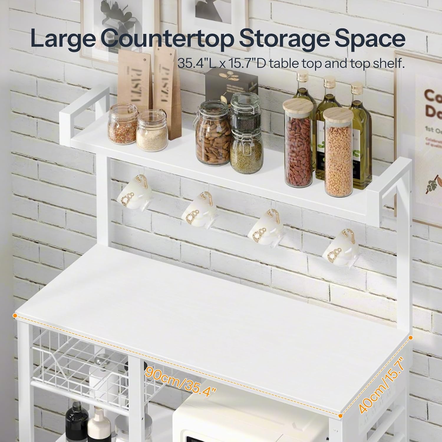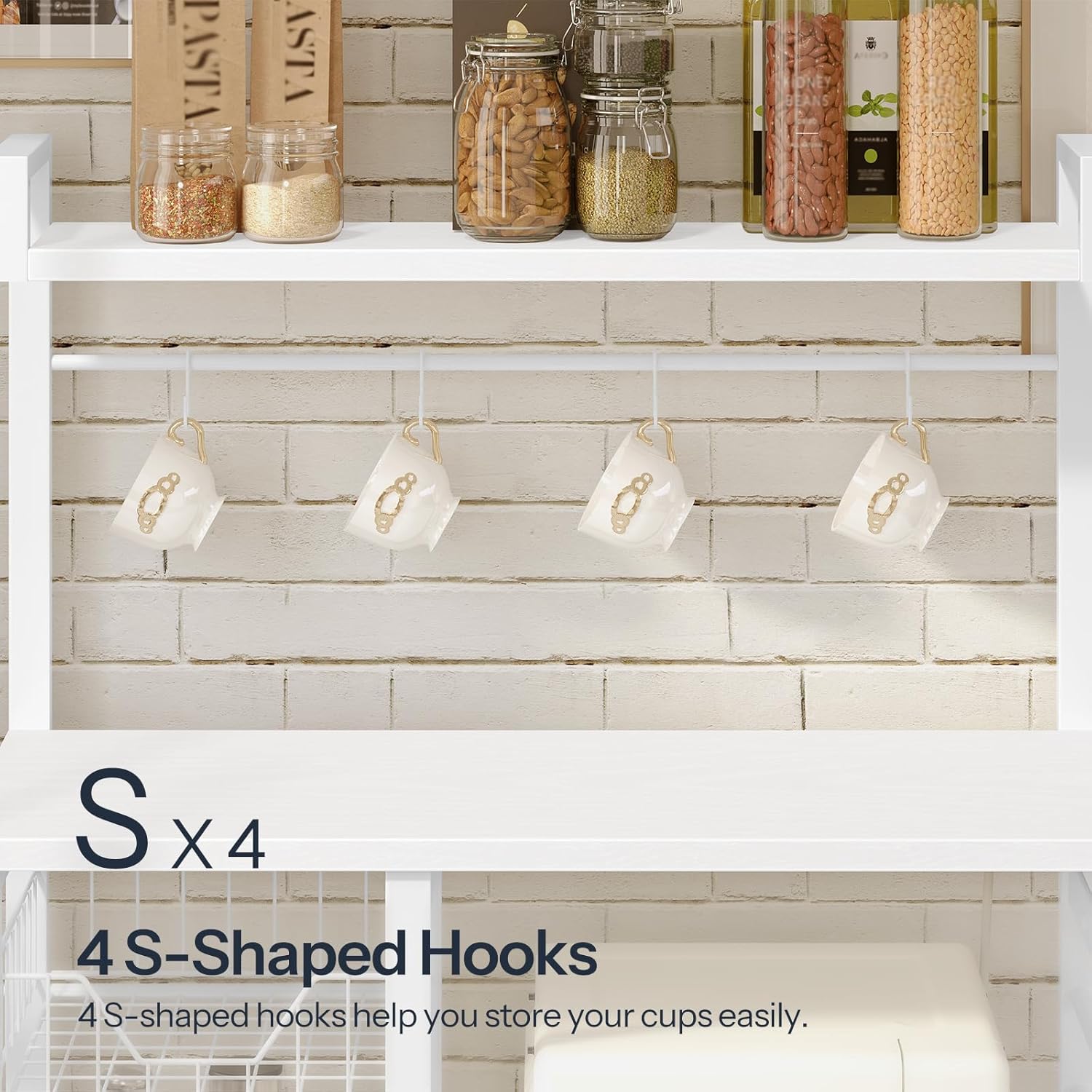 HOOBRO Bakers Rack with Power Outlet, 35.4 Inches Coffee Bar with Mesh Basket, Microwave Stand with 4 S-Shaped Hooks, Kitchen Bakers Rack with Storage, Easy to Assemble, White WT05HB01