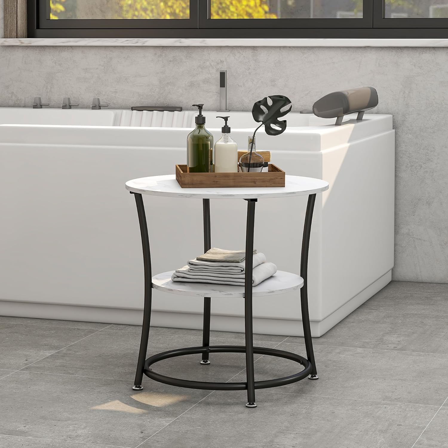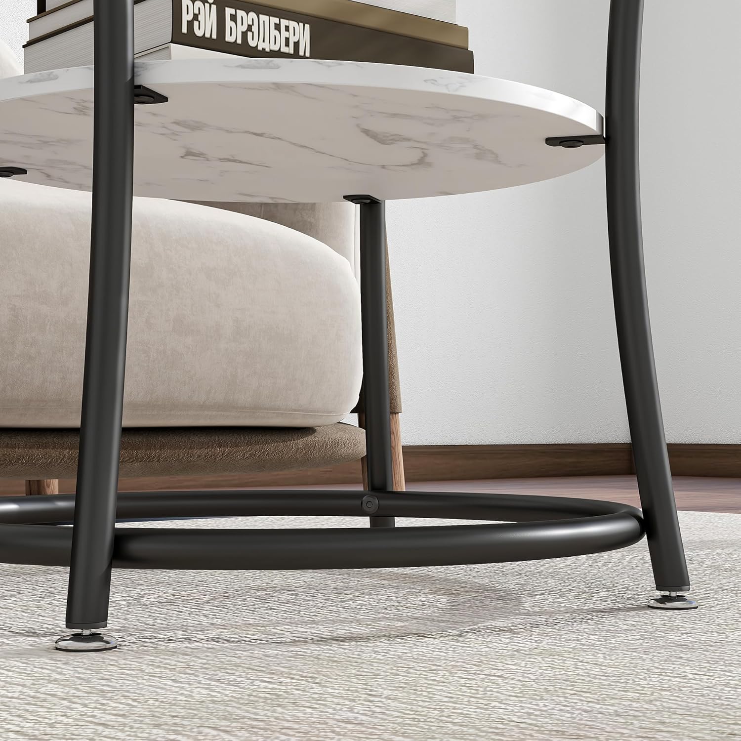 - ā High Quality and Durable Material:This MDF wood 2-tier end table with storage shelf is very sturdy,stable,loadable and eco-friendly.The table top can prevent scratches and be waterproof. The unique circular legs of this round coffee table is made of high-quality, sturdy, rust resistant metal material.