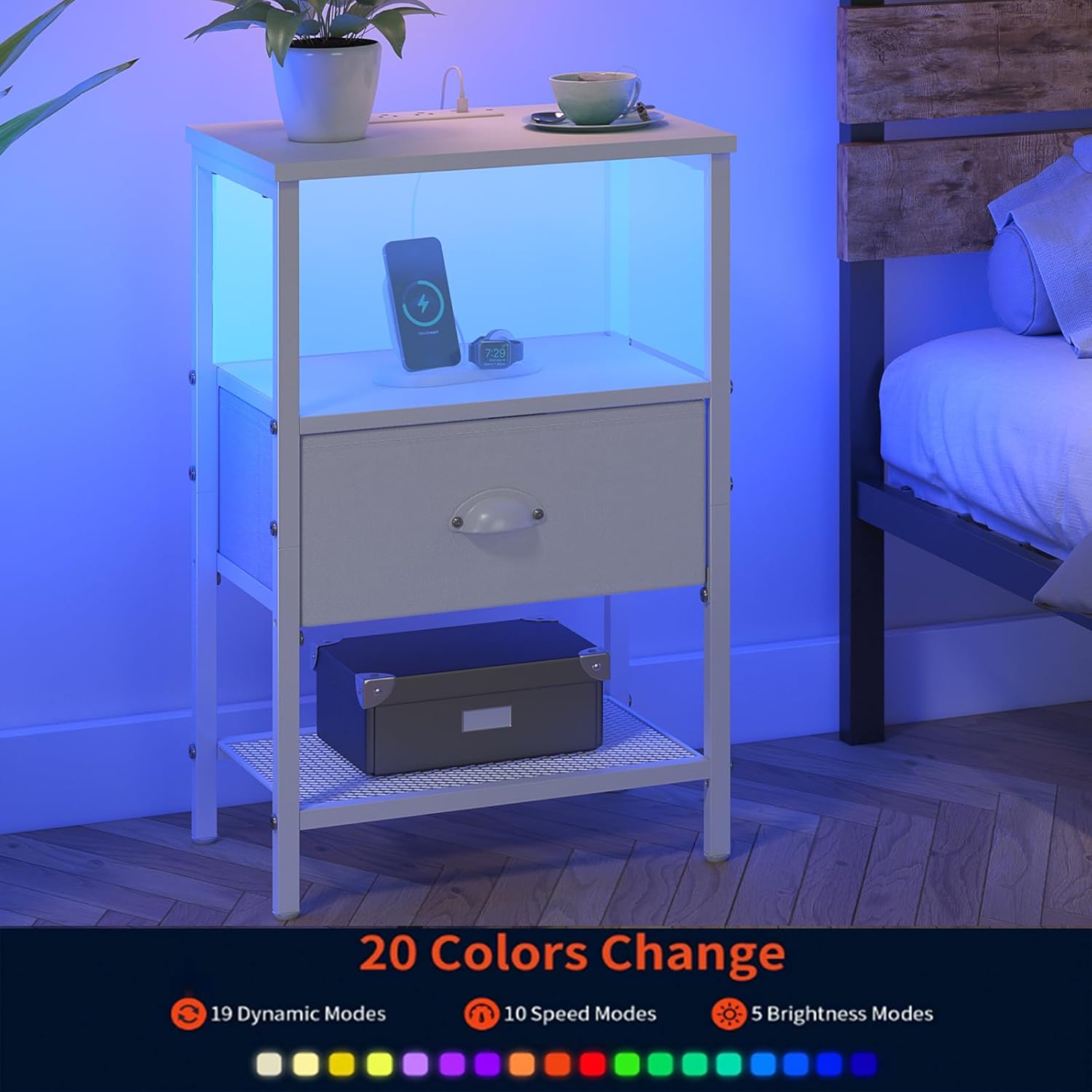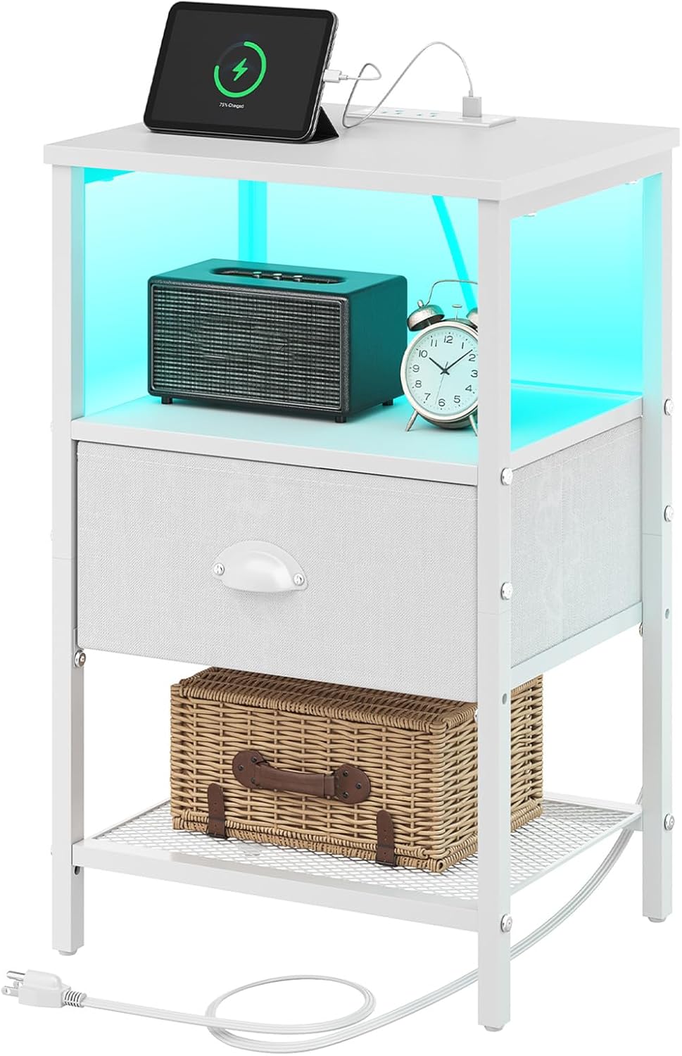 Sthmec Nightstands with Charging Station, LED Bedside Tables with Charging Station and Fabric Drawer, Night Stand with Storage, 3 Tier Side Table with Open Shelf, LED Nightstand Bedside Table,White