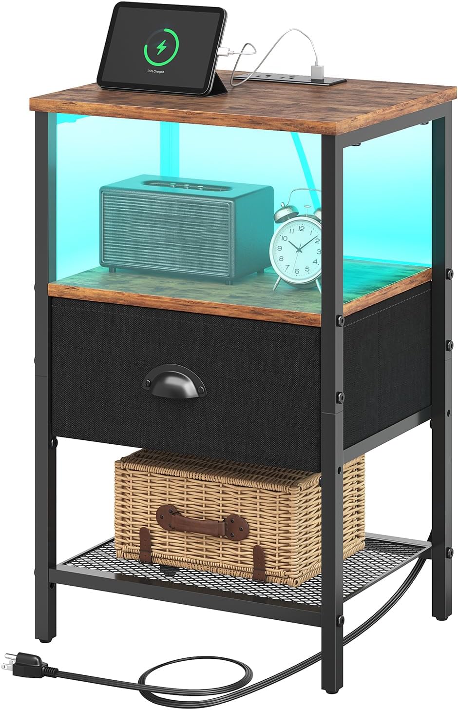 Sthmec Nightstands with Charging Station, LED Bedside Tables with Charging Station and Fabric Drawer, Night Stand with Storage, 3 Tier Side Table with Open Shelf,Nightstand Bedside Table,Rustic Brown