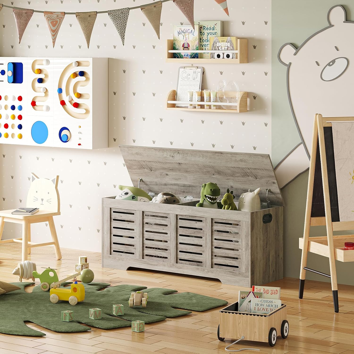 - 【Sturdy & Durable】The kids toy chest is made of safe engineered wood and superior craftsmanship. It is sturdy and durable to effectively prevent chemical reactions between the rubber staffs and the wood chest surface. Easy to wipe clean and upkeep. Your cost-effective choice