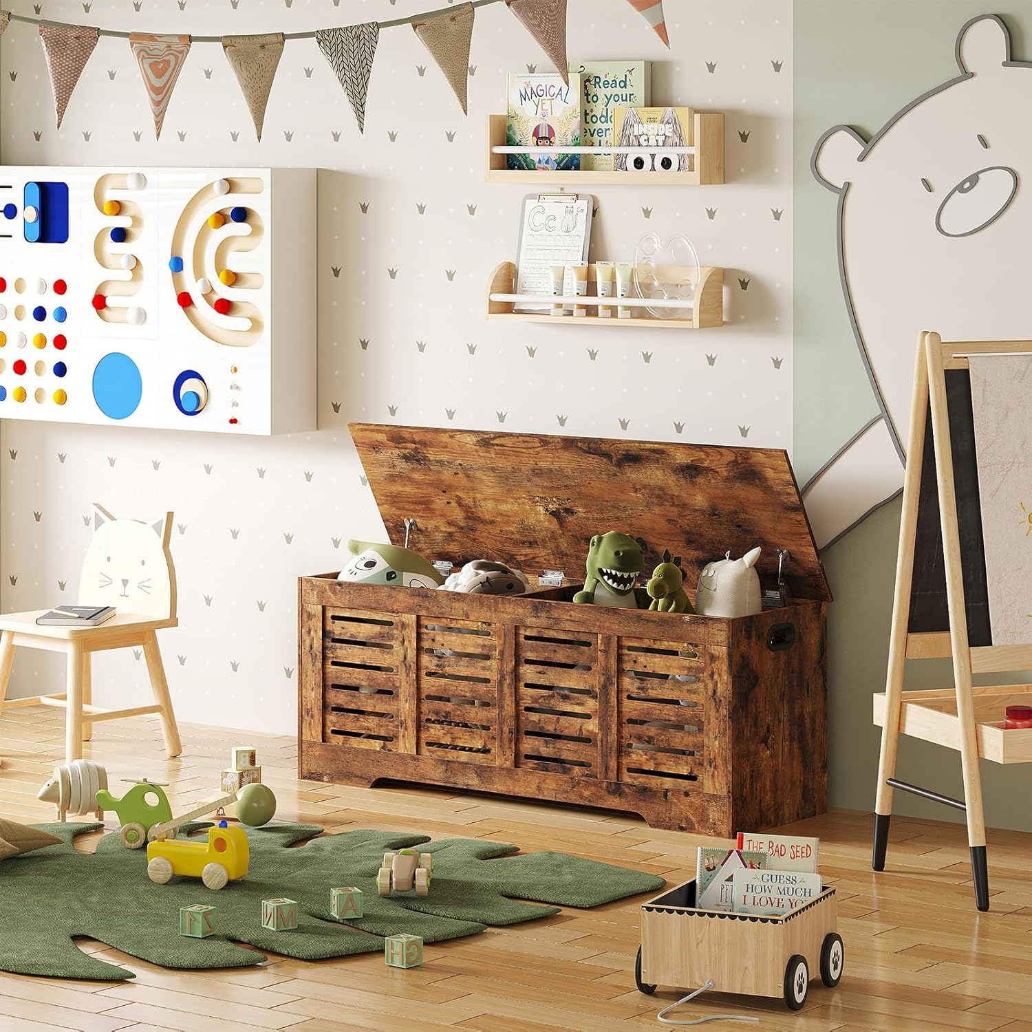 DINZI LVJ Storage Chest, 47.3” Wooden Toy Box with 2 Safety Hinges, Retro Entryway Shoe Storage Bench with Flip-Top, Sturdy Large Storage Trunk for Living Room, Bedroom, Easy Assembly, Rustic Brown