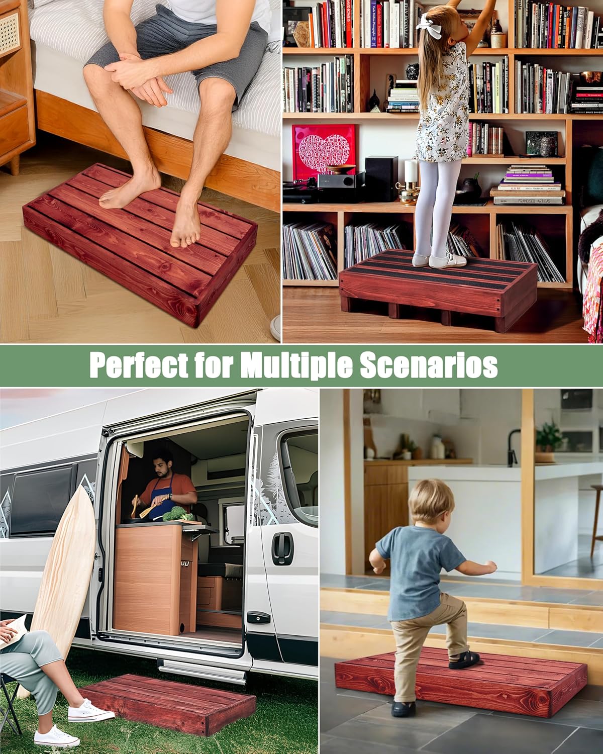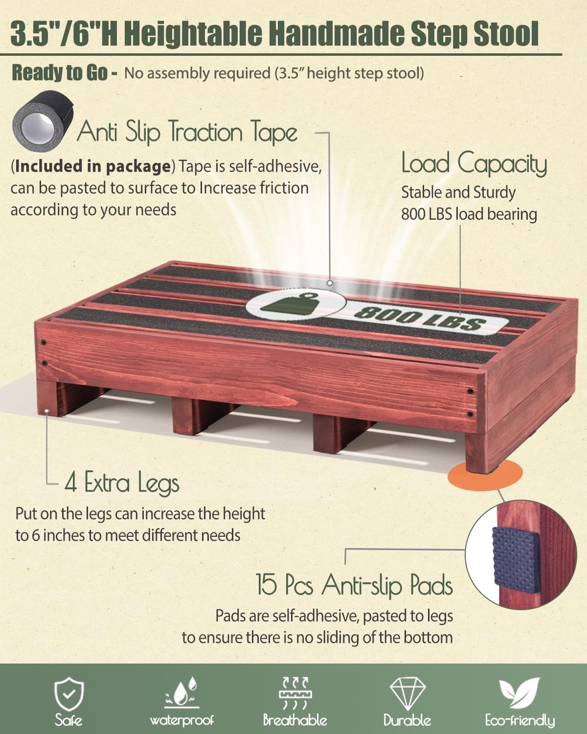 3.5"/6" Heightable Wooden Outdoor Step, 100% Heartwood Step Stools for Adults with 4 Additional Legs & Anti-Slip Traction Tape, One Step Stool for Elderly, Adults, Kids (30" L x 16" W)