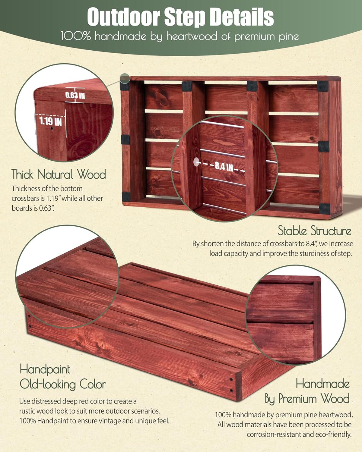 - 100% Heartwood - We use 100% heartwood that more stronger and high-density than spliced sapwood. Average weight of our outdoor step is more than 14 LBS. Great material makes it more durable and sturdy than the step mixed with sapwood.