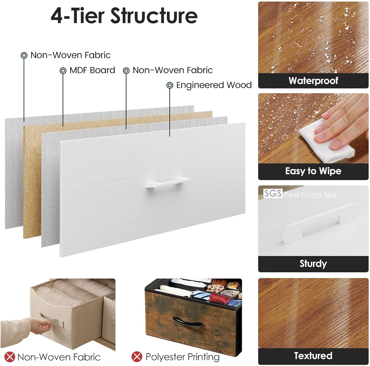 - 【Safety First】CARB P2 certified; Our fabric dresser organizer for adult use comes with 2 x anti-tip kits & 4 x plastic height-adjustable feet for added safety; For safety: 1.ALWAYS secure this fabric dresser to the wall using an anti-tip device; 2.NEVER allow children to stand, climb, or hang on drawers, doors, or shelves; 3.Do not defeat or remove the drawer interlock system; 4.Place the heaviest items in the lowest drawers; 5.NEVER put a TV on this furniture