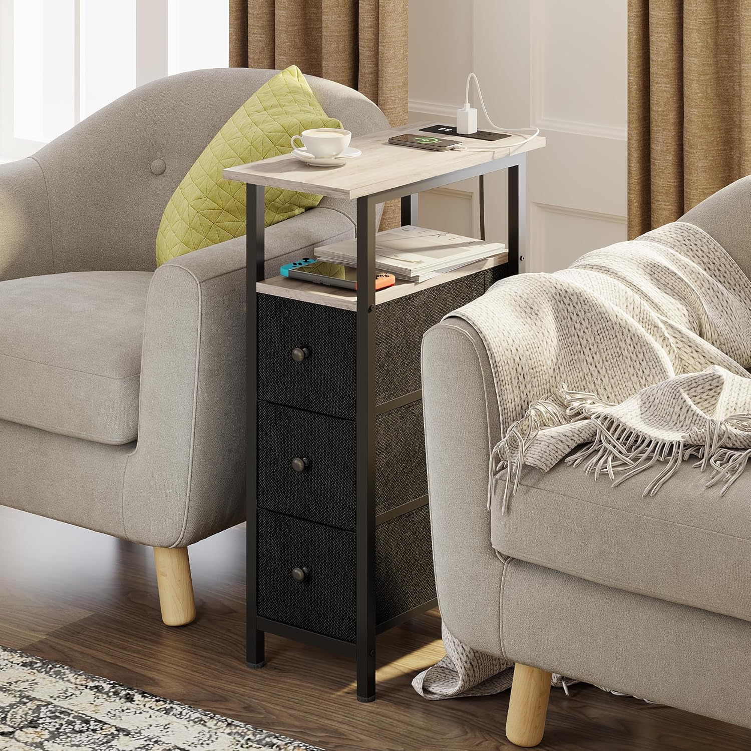 End Table with Charging Station, Narrow Side Table with 3 Fabric Drawers, Skinny Nightstand with LED Light, Slim Bedside Table for Bedroom, Living Room, Small Spaces, Greige and Black