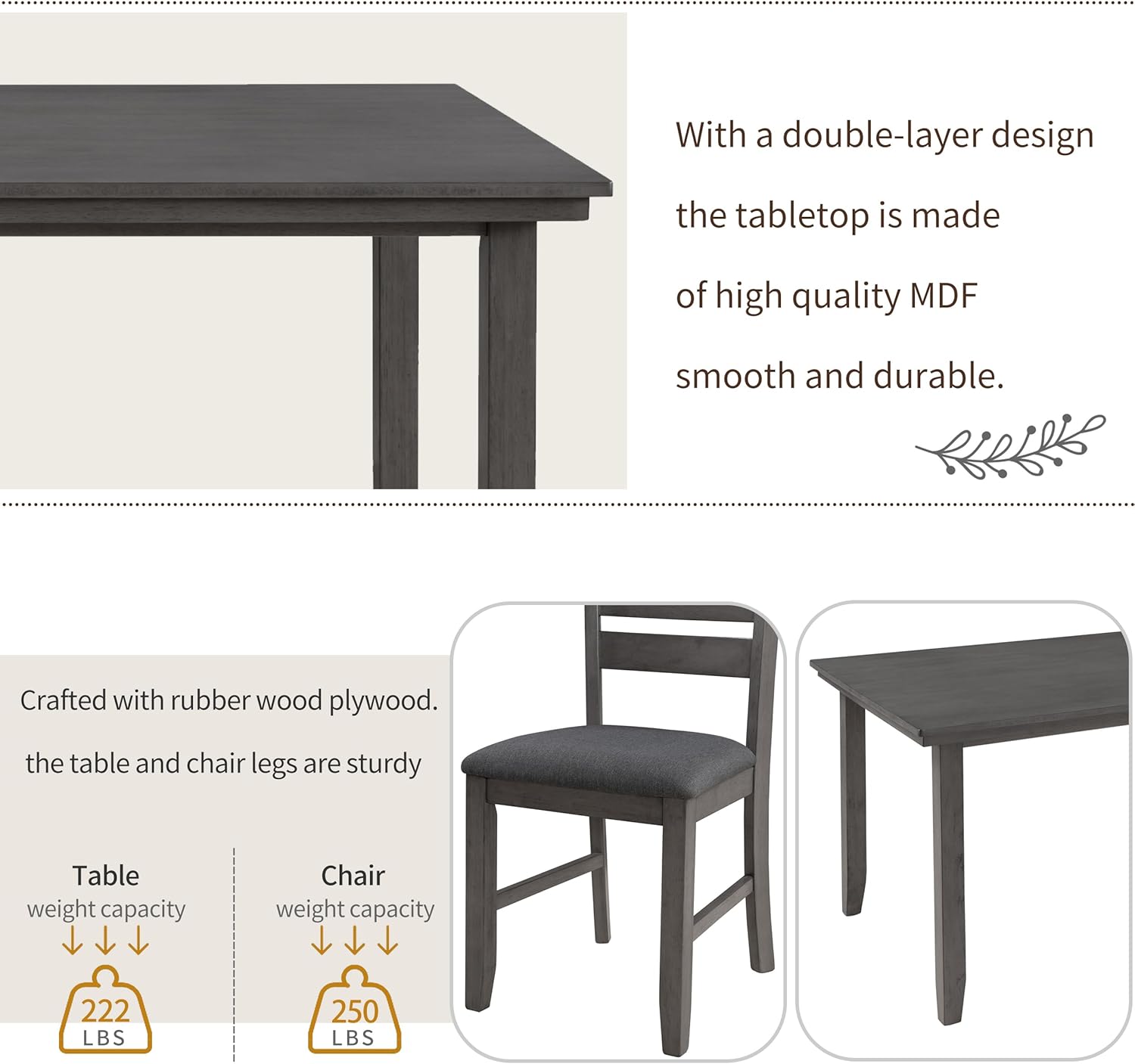 - Premium Quality: With a double-layer design, the tabletop is made of high-quality MDF, smooth and durable. Crafted with rubber wood LVL, the table and chair legs are sturdy enough to support you and your family. Table weight capacity: 222 lbs; Chair weight capacity: 250 lbs; Bench weight capacity: 250 lbs.
