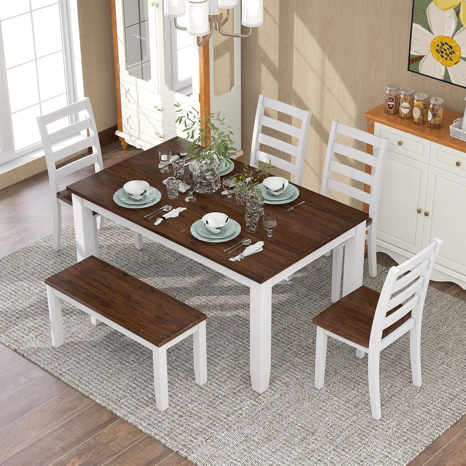 Ball & Cast 6 Piece Dining Table Set with 4 Upholstered Chairs & 1 Bench,Wooden Living Room Furniture W/ 60" Rectangle Kitchen Desk,for Restaurant,Home Bistro,Walnut + Cottage White