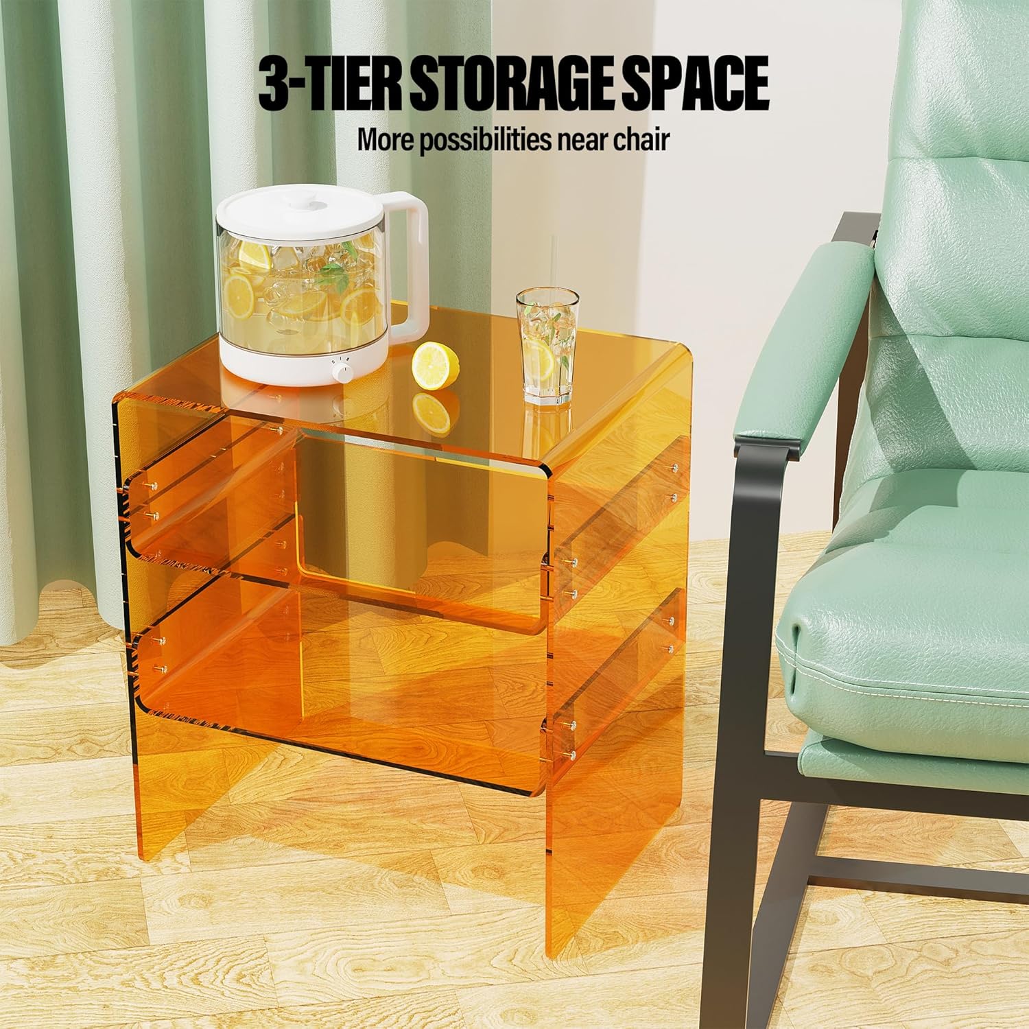 Acrylic 2-Tier Side Table with Storage Mini Modern End Table/Nightstand with Double Shelves for Bedroom, Living Room, and Bathroom Easy Assembly Orange
