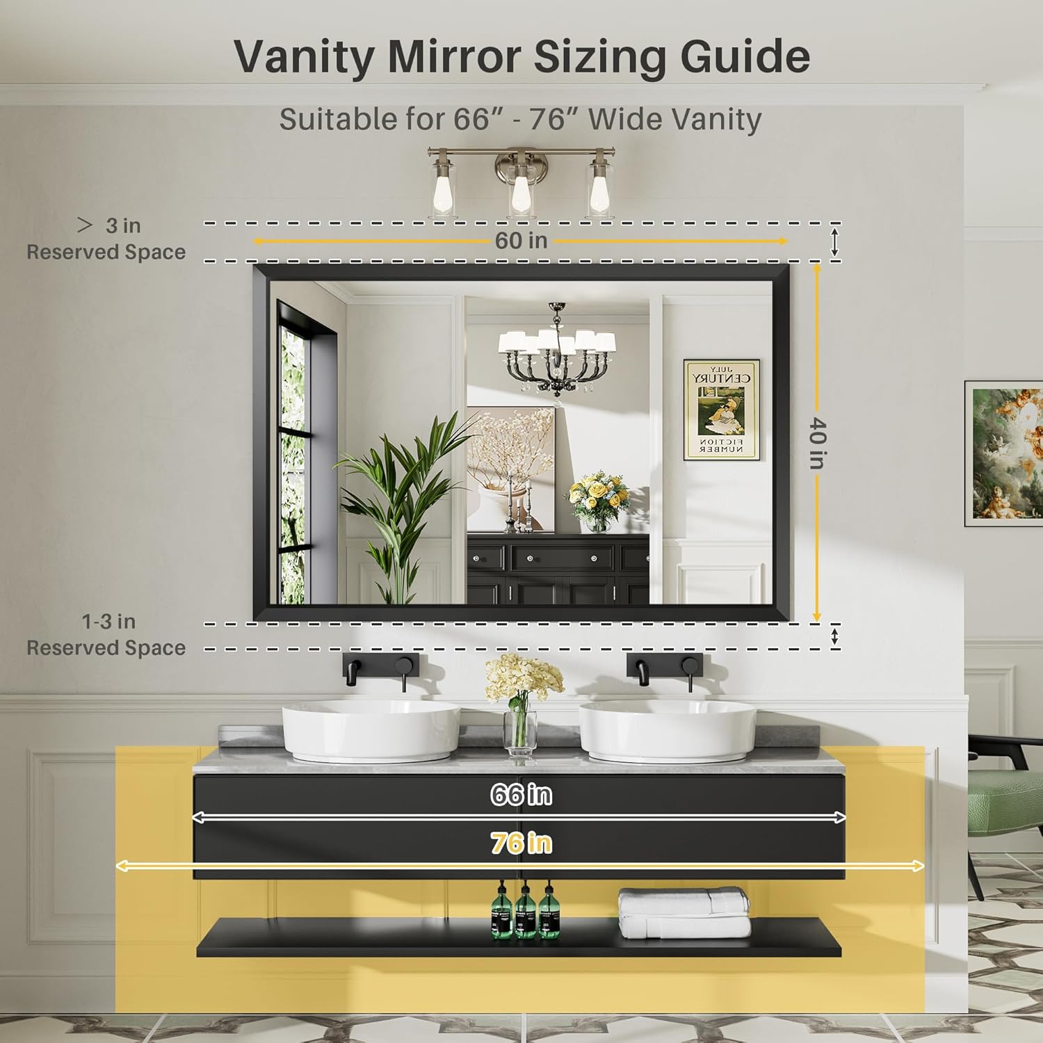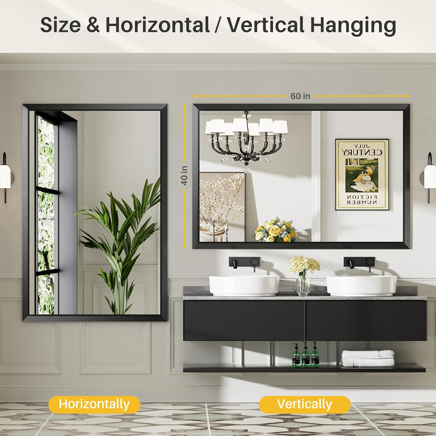 60x40 Inch Black Bathroom Mirror for Wall, Thick Metal Framed Rectangle Mirrors for Over Sink, Bedroom, Living Room, Entryway, Anti-Rust, HD Tempered Glass