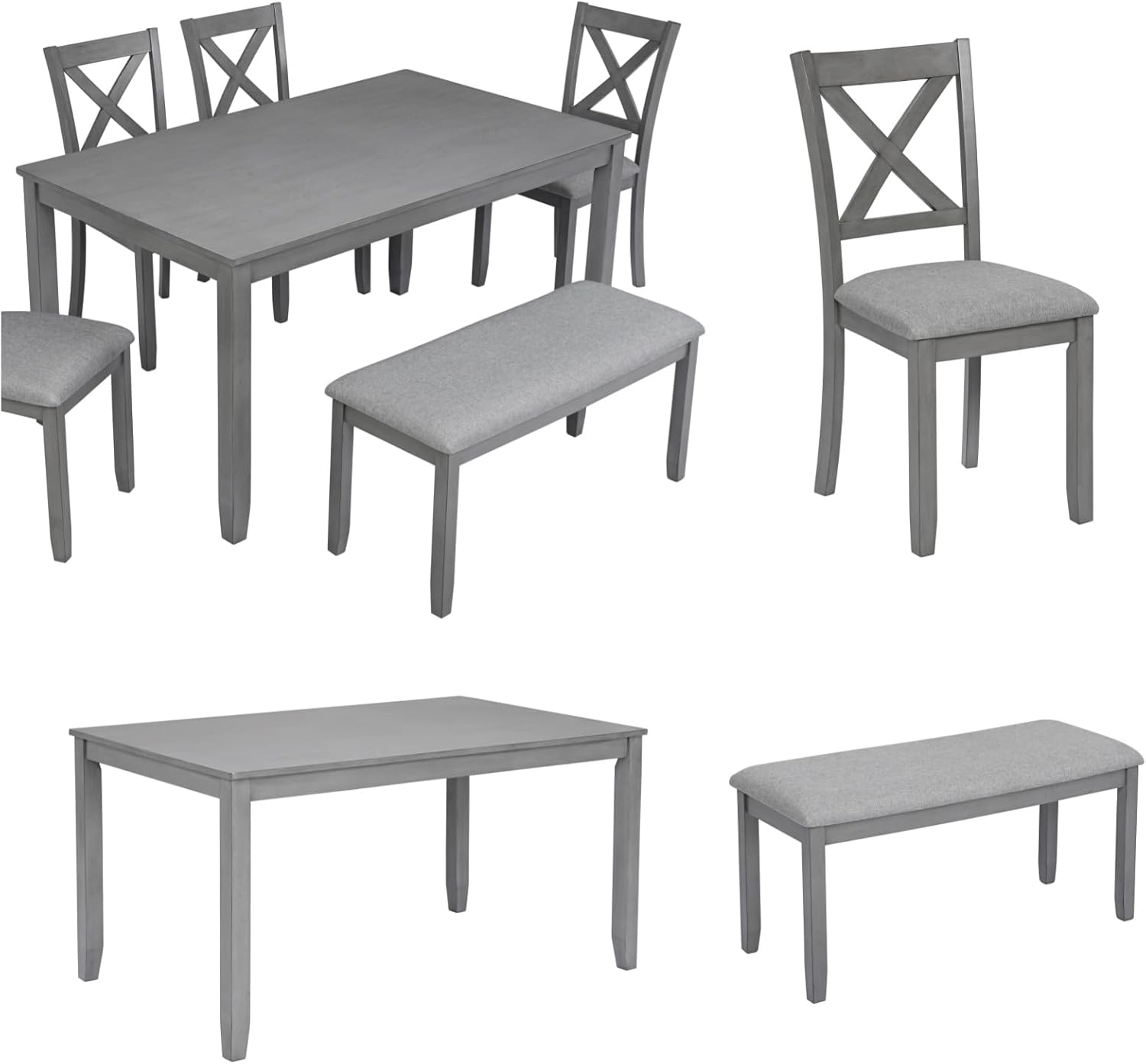 Dining Table Set, 6-Piece Kitchen Table & Chair Set with Rectangular Dining Table, 4 Upholstered X-Shaped Backrest Chairs and a Bench, Wooden Dining Table Set for 6 People, Gray
