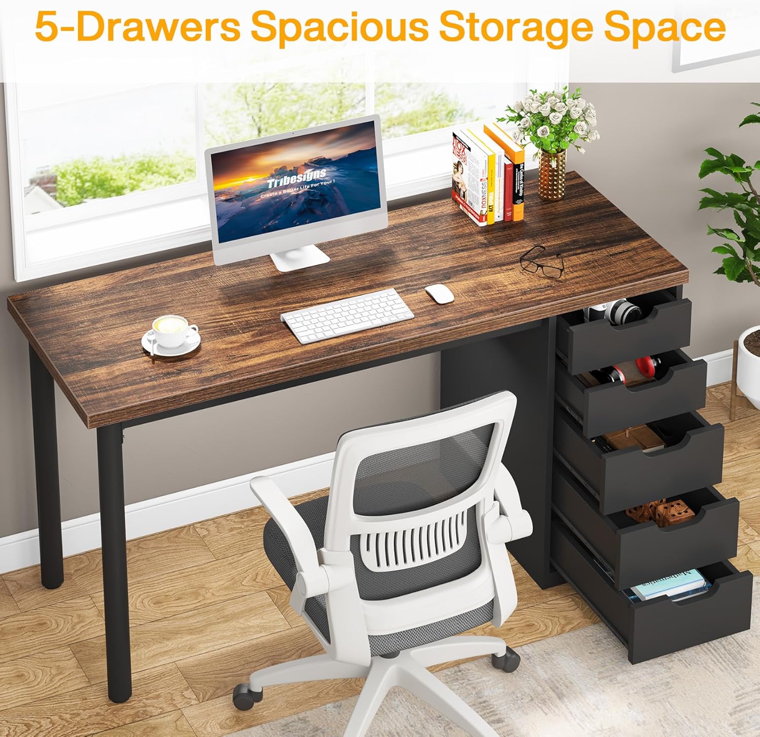 - Practical Storage Solution: Tribesigns Modern Simple Computer Desk is equipped with 5 deep drawers, providing plentiful storage space for organizing all your work essentials. Say goodbye to cluttered desktops, with ample room to store laptop, books, office supplies and paperwork. This practical storage solution ensures a cleaner, organized workspace, ultimately boosting productivity and offering peace of mind.