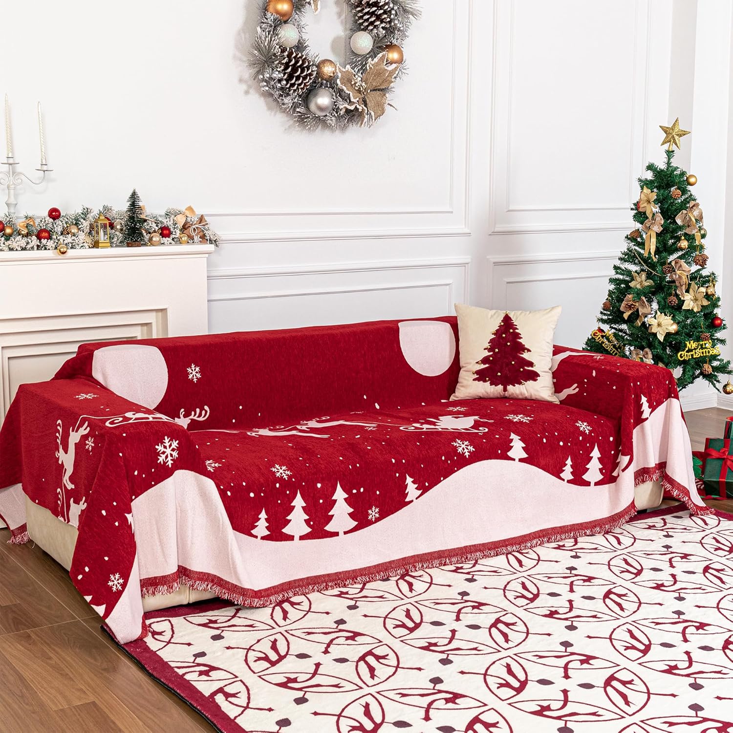 MYSKY HOME Christmas Chenille Sofa Slipcover Couch Covers for Sectional l Shaped Couch Pets Protector Furniture Covers Futon Cover Super Soft Washable Couch Covers for 2 Cushion, 71"x102", Red