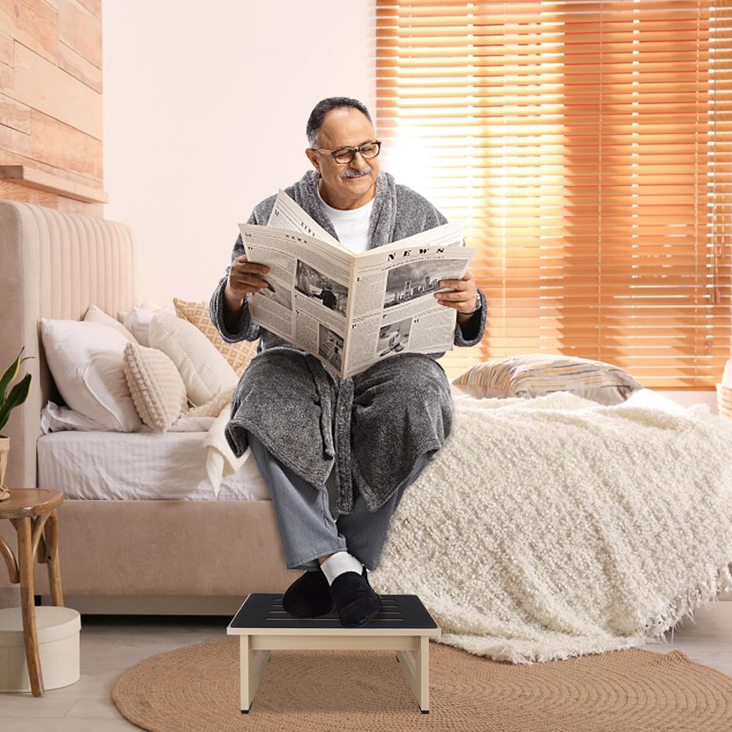 - 【Safe,Portable and Comfortable】 : This bed step stool is crafted for convenience and portability with a 450 lbs, It's just 6.9'', which is easy to use all over your home for a quick, supportive boost. Suitable for medium height mattresses 14-16 inches, using this as a bedside stool for high bed. This bedside stepstool is just the right height for you to climb into the bed