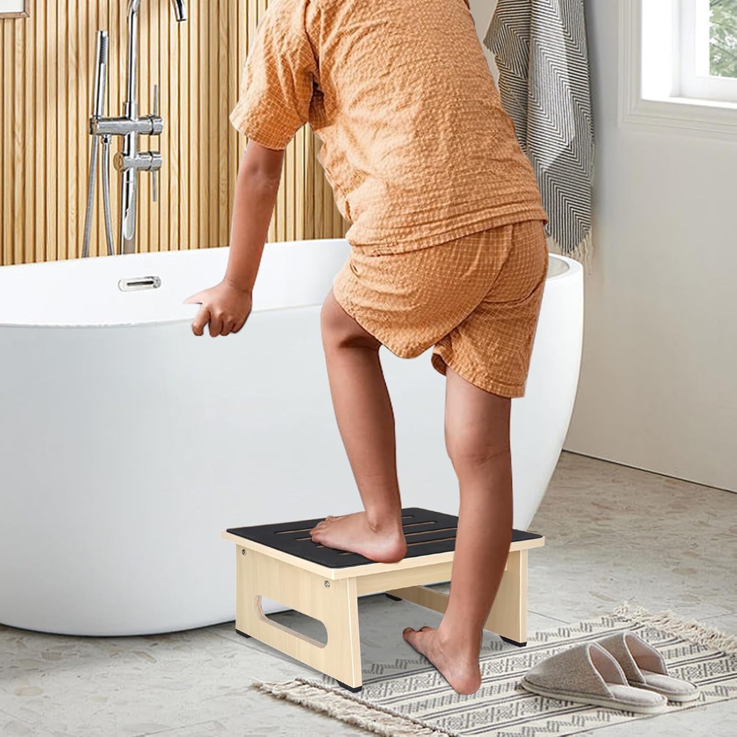 - 【High-Quality Wooden Step Stool】 : Safe and portable step stool can help improve the reachable distance, which makes our stepping stool ideal for getting a leg up in the bedroom, bathroom, kitchen, platform, bedside, stairs Indoor steps, stairs outdoor steps, bookcase, old age shower, laundry room, or even by the bed to providing a guarantee for the safety of adults kids and elderly