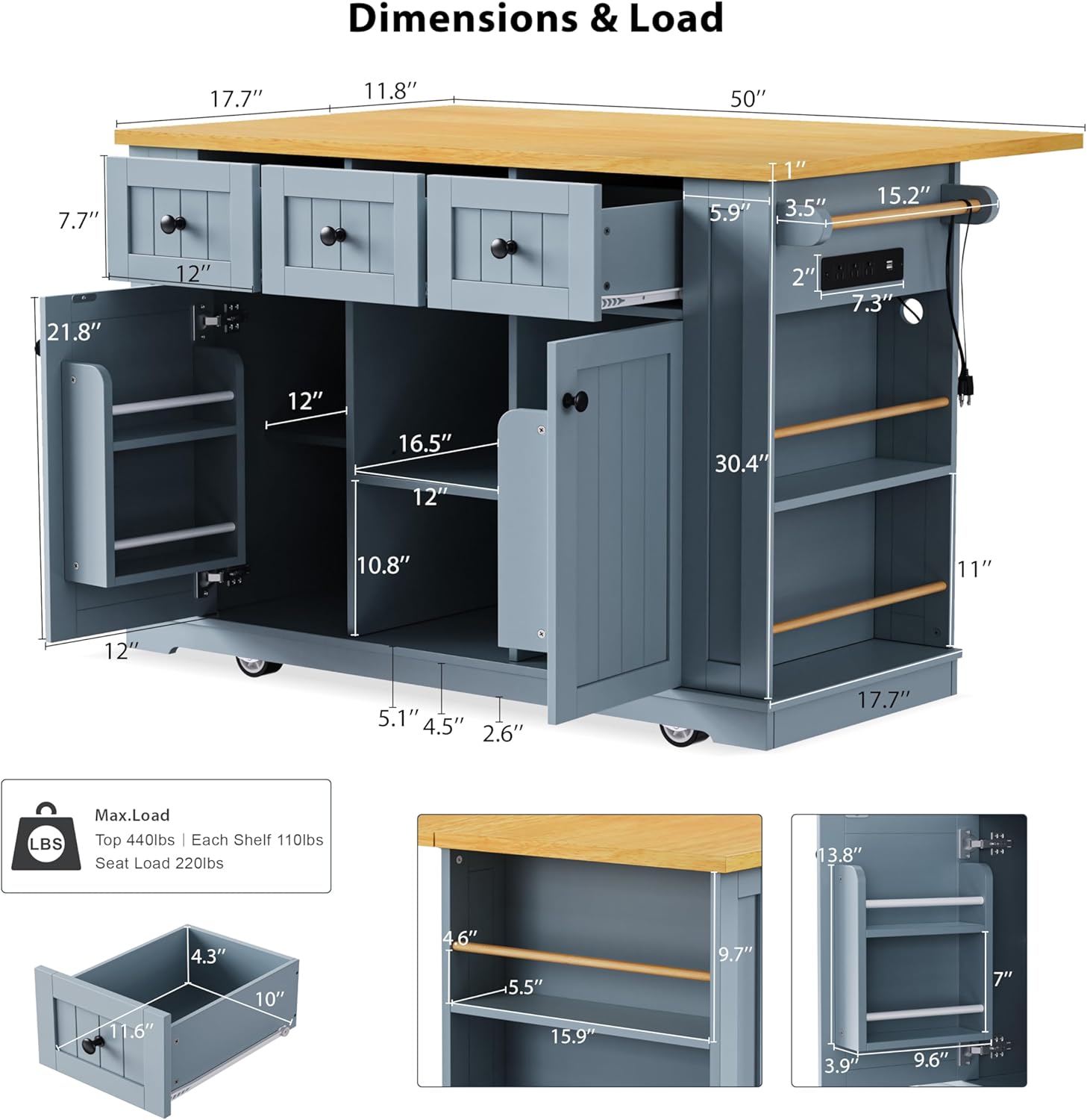 YOTPO 53" Large Kitchen Island with Drop Leaf,Power Outlet & Door Internal Storage Rack,Rolling Kitchen Cart on 5 Wheels W/ 5 Open Side Racks for Kitchen,Dining Room,Grey Blue(Not Include bar stools)