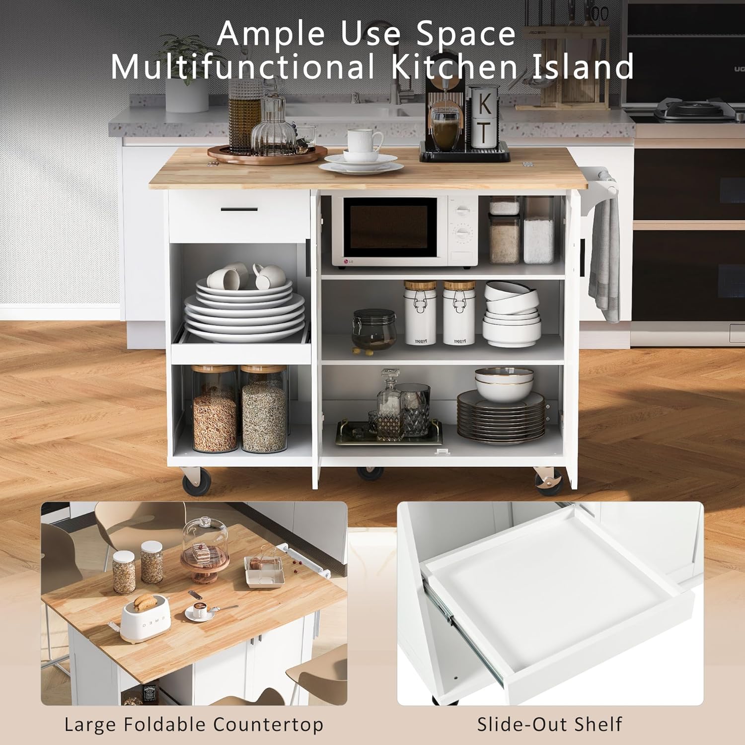 - [Convenient Folding Counter Top] The kitchen island's countertop can be used when folded or opened for wider use. When the countertop is not open, you can use a metal latch on the back to lock it in place. This way you can prepare food on the 47.24 "x16.57" countertop, which you can easily use without having to walk back and forth. If you open the countertop, the 47.24 " x 33.15" countertop can accommodate more kitchen tools for you to operate, instantly upgrading your use space.