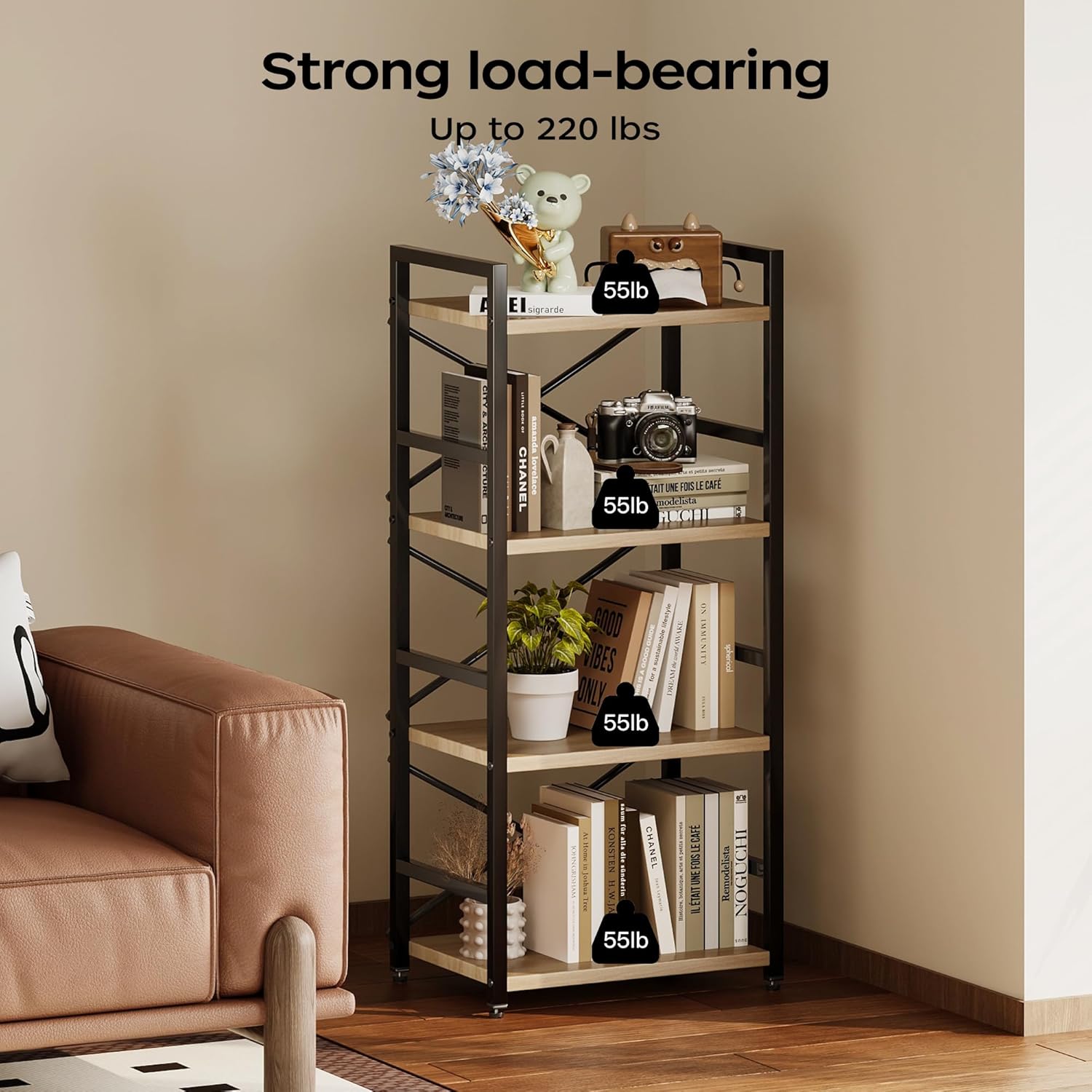 Bookshelf, Kid's Bookshelf, 4 Tier Small Bookcase, Metal Small Bookcase, Book Shelf Organization and Storage for Living Room, Bedroom, and Home Office (Light Coffee)
