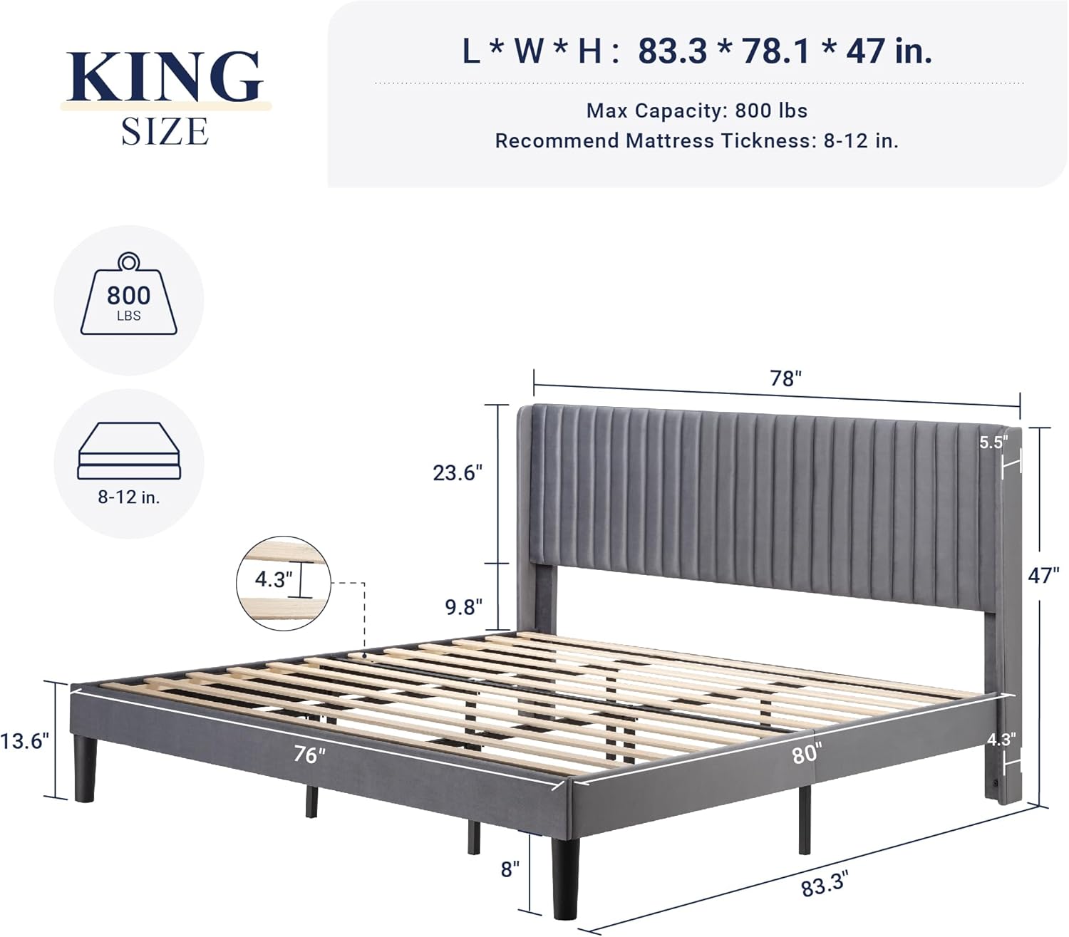 Allewie King Size Velvet Bed Frame/Vertical Channel Tufted Wingback Headboard/Upholstered Platform Bed/No Box Spring Needed/Strong Wooden Slats/Easy Assembly/Grey