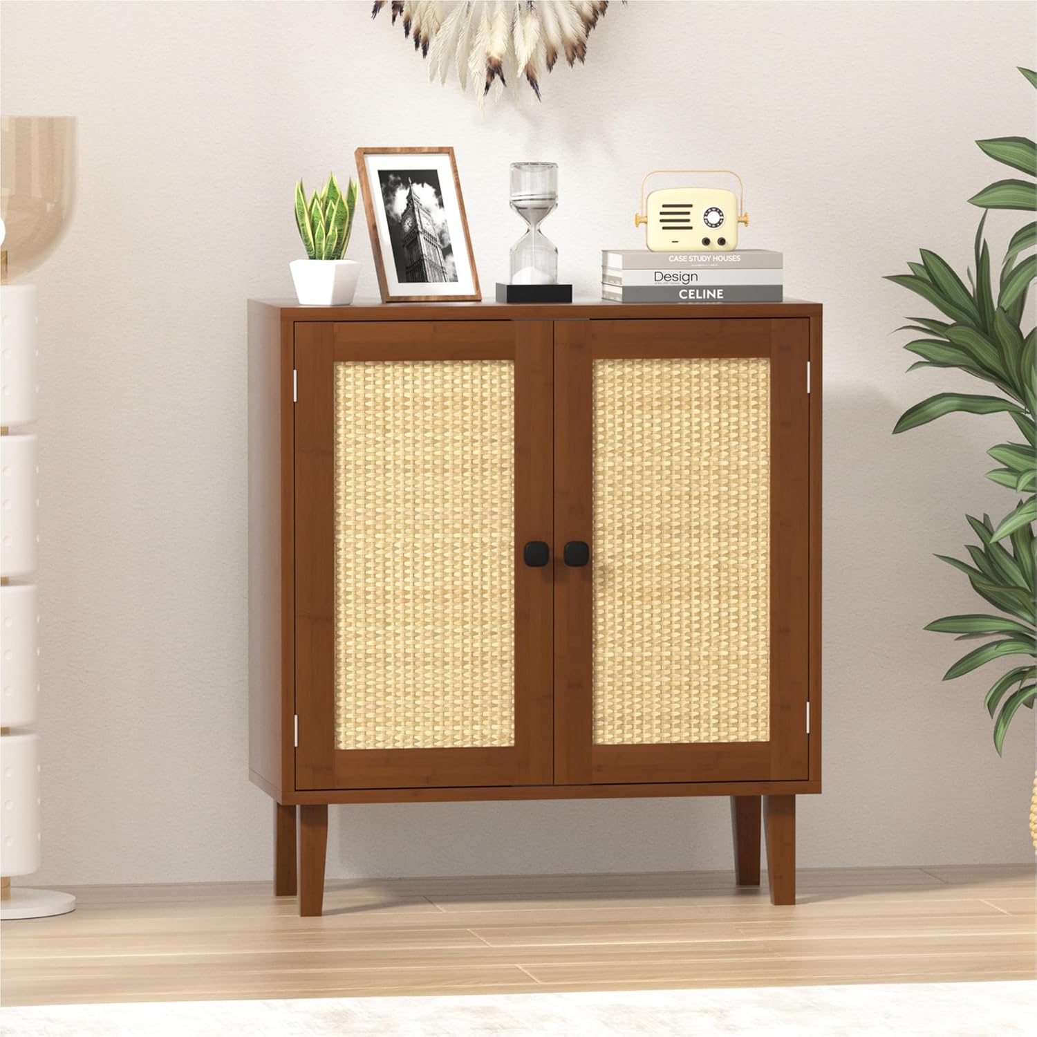 Bamboo Sideboard Buffet Cabinet with Rattan 2 Doors Kitchen Cupboard Accent Entryway Living Room Cabinet Chestnut Brown