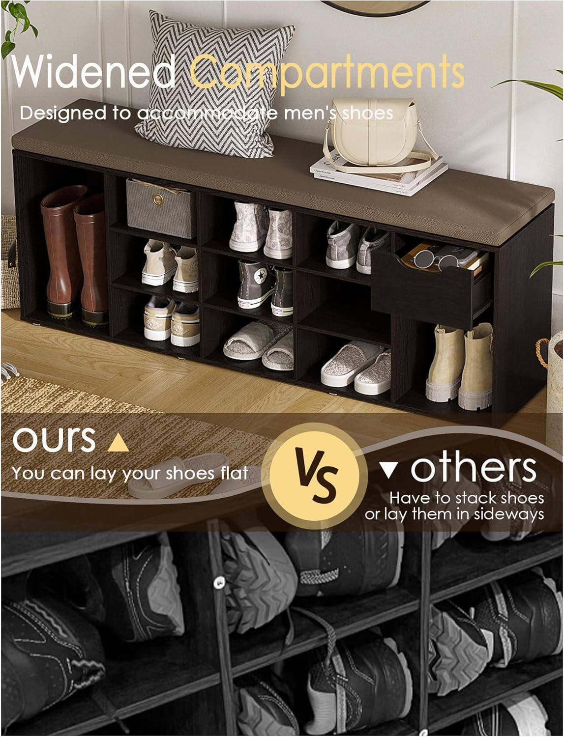 DINZI LVJ Shoe Bench, Entryway Storage Bench with Drawer and 14 Cubbies, Long Cubby Shoe Rack with Adjustable Shelves, Organizer for Living Room, Bedroom, Mudroom, Garage, Espresso