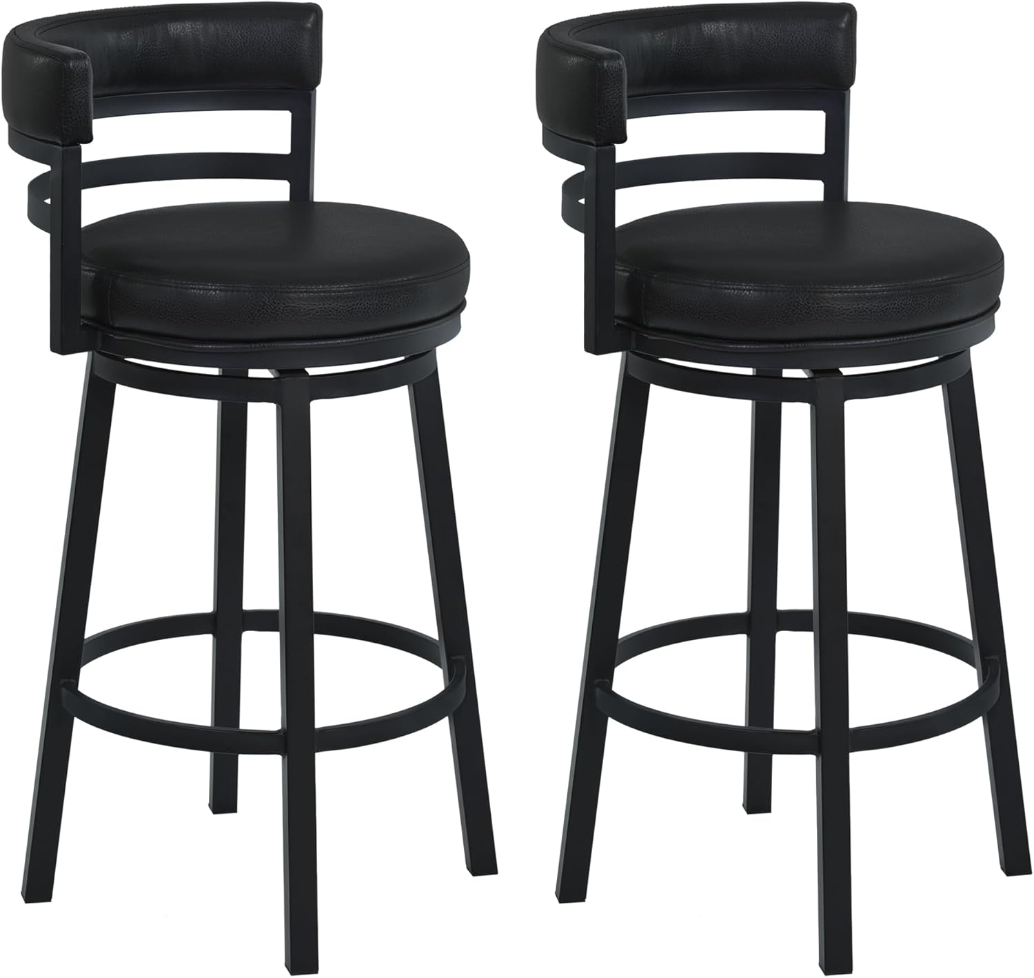 Armen Living Madrid 30" Seat Height Swivel Ford Black Faux Leather and Black Finish Bar Stool for Kitchen Island Counter, Set of 2
