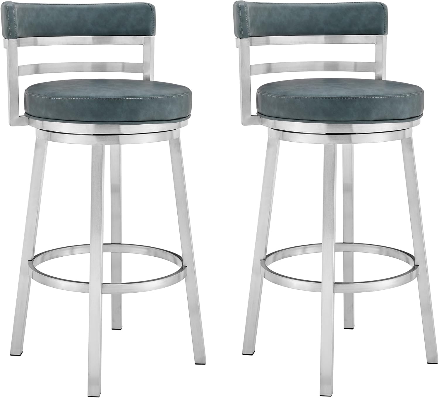 Armen Living Madrid 30" Seat Height Swivel Modern Blue Faux Leather and Brushed Stainless Steel Bar Stool for Kitchen Island Counter, Set of 2