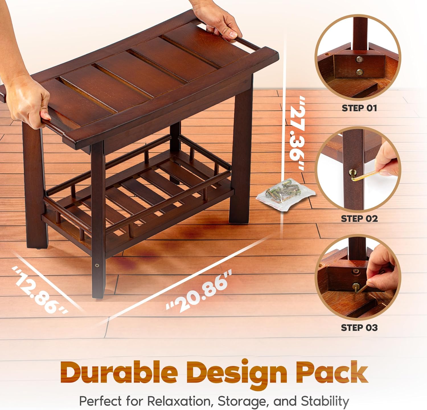 - Exclusive Storage & Multi-Functional Use: Features a unique under-seat shelf with protective wooden sides to organize your essentials securely. Perfect for use in bathrooms, living rooms, balconies, and gardens, offering spa-like luxury in any space.