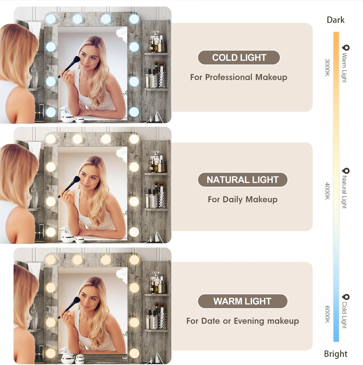 - 3 color temperature LED lights can be switched, you can change the color or brightness according to any scene or makeup needs, which allows you to better control the lighting and room atmosphere and helps you create the best makeup look every day. There is a built-in charging board on the desktop, which does not take up much space and is convenient for using hair curlers, hair dryers, beauty instruments, mobile phone charging.