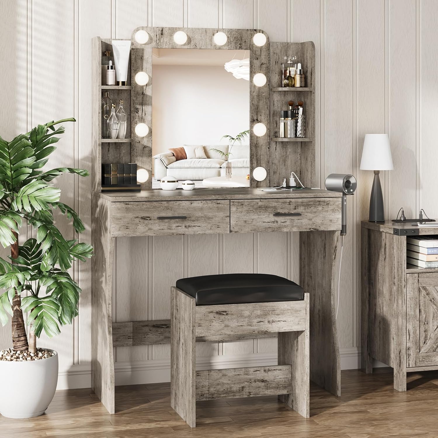 - Made of high quality materials, it has a strong load-bearing capacity,and stability, and a smooth finish that is easy to clean. Added a hairdryer holder for easy access and use.This vanity desk with mirror and lights is simple, elegant, and stylish which can perfectly match your other furniture and add magic and fashion charm to your room.