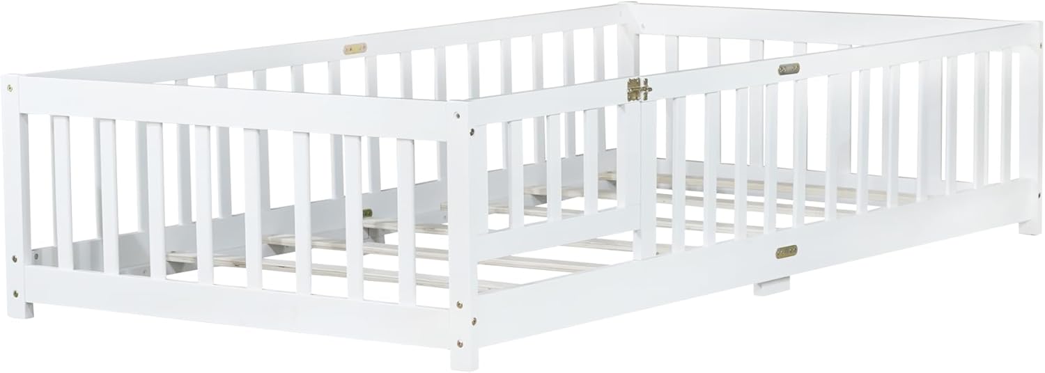 Twin Floor Bed with Slats and Center Support Bar, Wood Montessori Floor Bed with Fence and Door, Kids Montessori Bed Twin Size, Twin Size Montessori Floor Bed for Kids, Girls, Boys(Twin White)