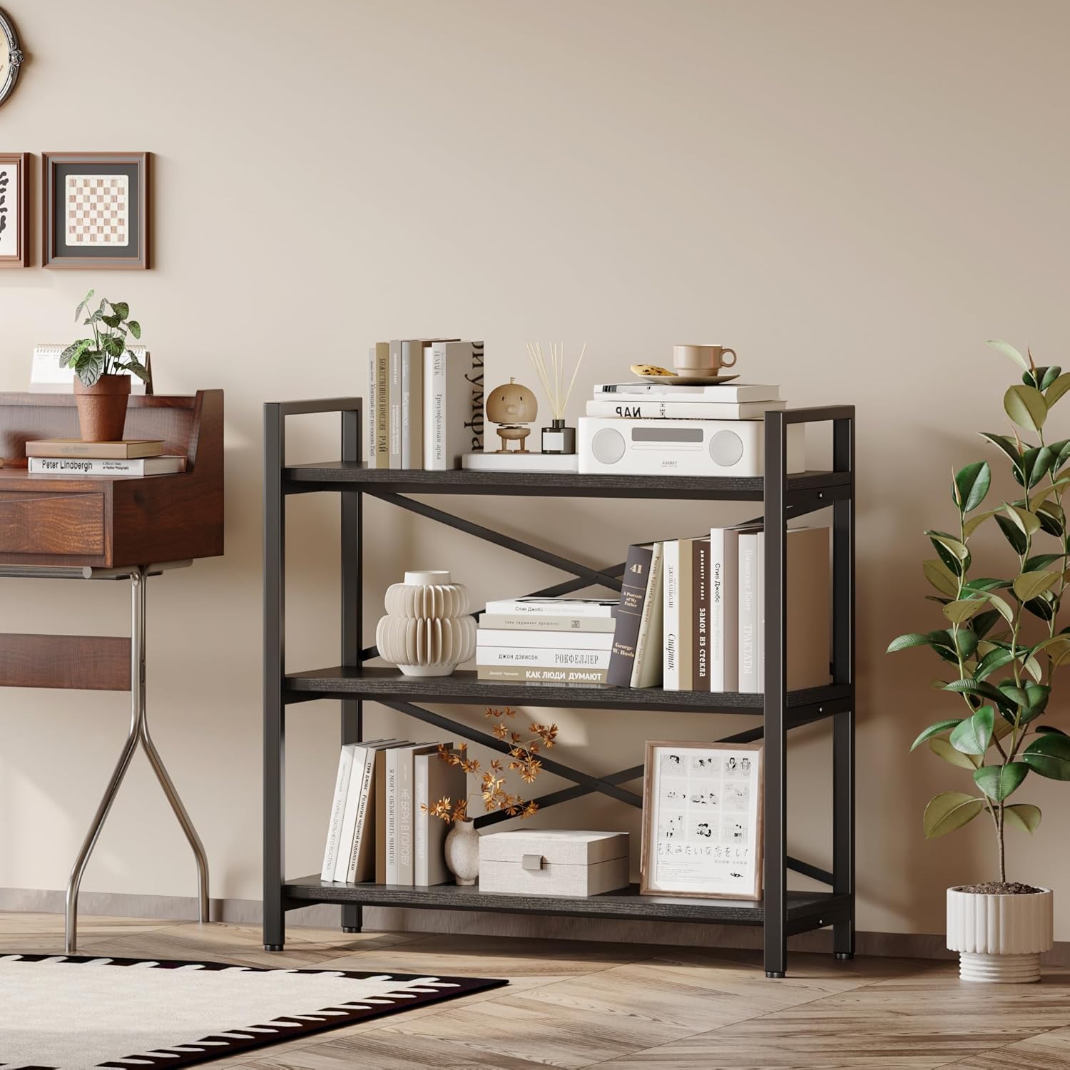 Homeiju 3 Tier Bookshelf 31.49" Width, Wood and Metal Etagere Bookcase, Vintage Farmhouse Modern Wooden Big Book Shelf for Home Living Room Bedroom Office Storage(Black)