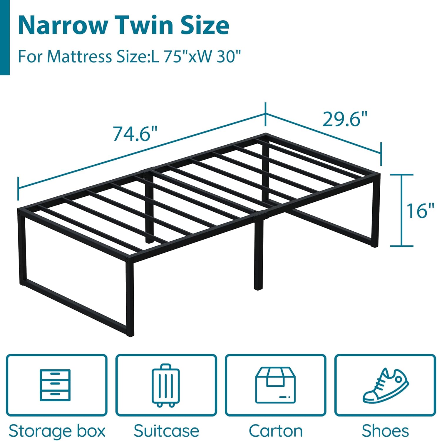 - Narrow twin size bed frame dimensions: 74.6" L x 29.6"W x 16" H for mattress size: 75"L x 30"W